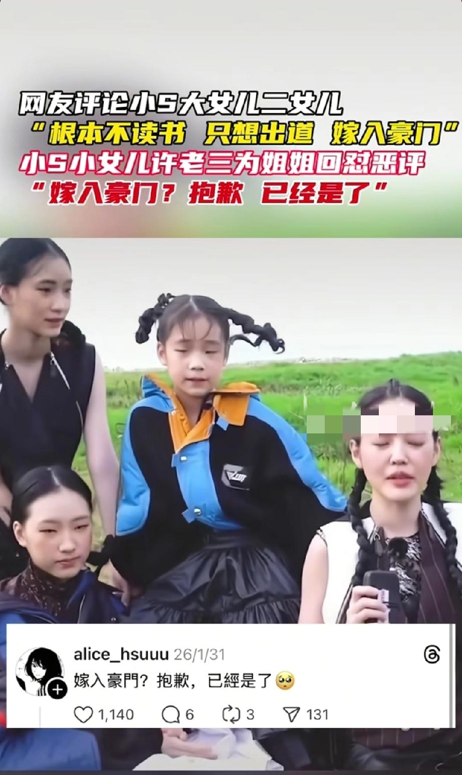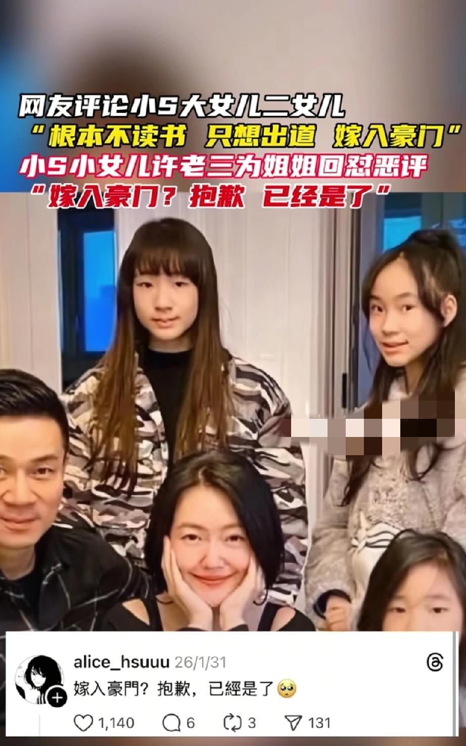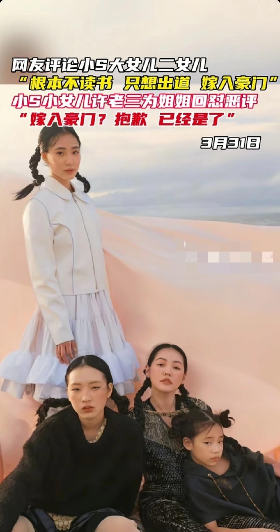 小S女儿遭酸民呛「不读书想嫁豪门」 许老三霸气护姊:已经是了。 小S家这几个女儿真是话题不断。大女儿在南加州读大学,二女儿在贵圈发展,小女儿许老三也开始频繁露面。最近,许老三在Threads上霸气护姐,反击酸民。有酸民吐槽她姐姐Elly和Lily“不读书想嫁豪门”,许老三直接反讽回应“嫁入豪门?抱歉,已经是了”。 其实之前许老三就有过类似的霸气操作。3月她曾在账号回怼网友,起因是一张旧合照,网友恶评她姐姐,她直接强调“我们本来就是豪门”。不得不说,许老三这护姐的样子太飒了,颇有小S怼酸民的影子,难怪网友纷纷为她点赞。 小s全家 小s豪宅 小S家教争议