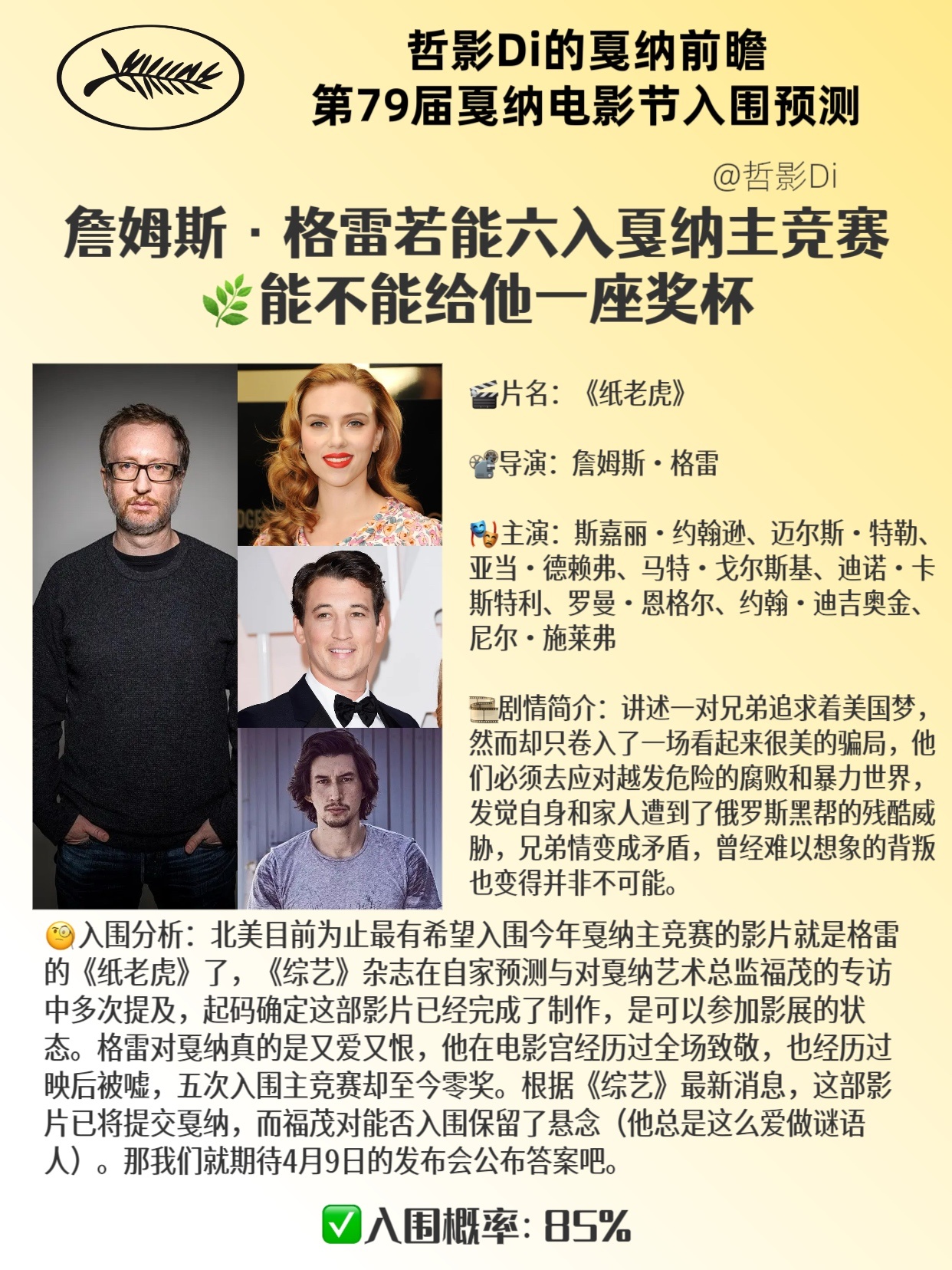🎞️剧情简介:讲述一对兄弟追求着美国梦,然而却只卷入了一场看起来很美的骗局,他们必须去应对越发危险的腐败和暴力世界,发觉自身和家人遭到了俄罗斯黑帮的残酷威胁,兄弟情变成矛盾,曾经难以想象的背叛也变得并非不可能。🧐入围分析:北美目前为止最有希望入围今年戛纳主竞赛的影片就是格雷的《纸老虎》了,《综艺》杂志在自家预测与对戛纳艺术总监福茂的专访中多次提及,起码确定这部影片已经完成了制作,是可以参加影展的状态。格雷对戛纳真的是又爱又恨,他在电影宫经历过全场致敬,也经历过映后被嘘,五次入围主竞赛却至今零奖。根据《综艺》最新消息,这部影片已将提交戛纳,而福茂对能否入围保留了悬念(他总是这么爱做谜语人)。那我们就期待4月9日的发布会公布答案吧。✅入围概率:85%