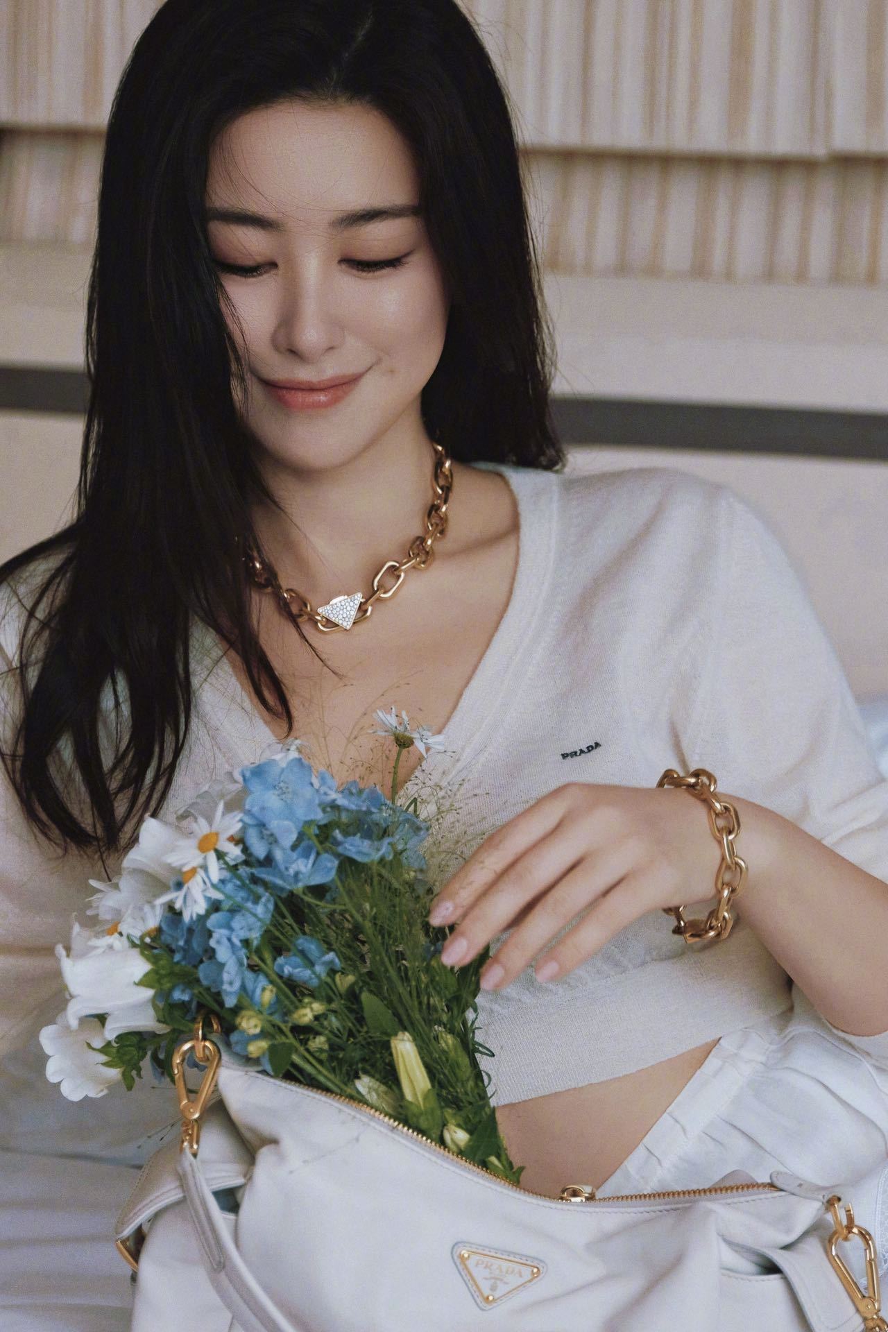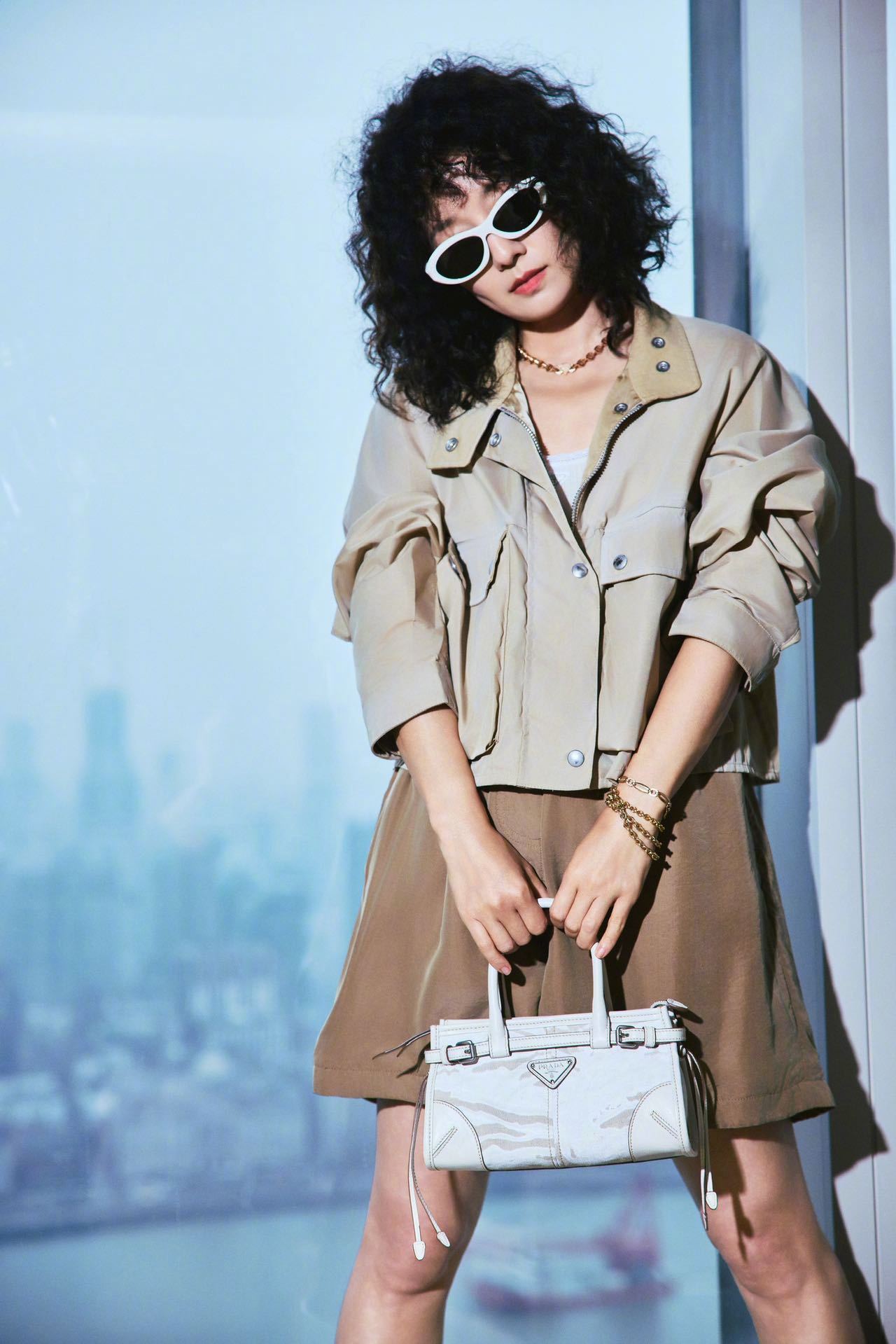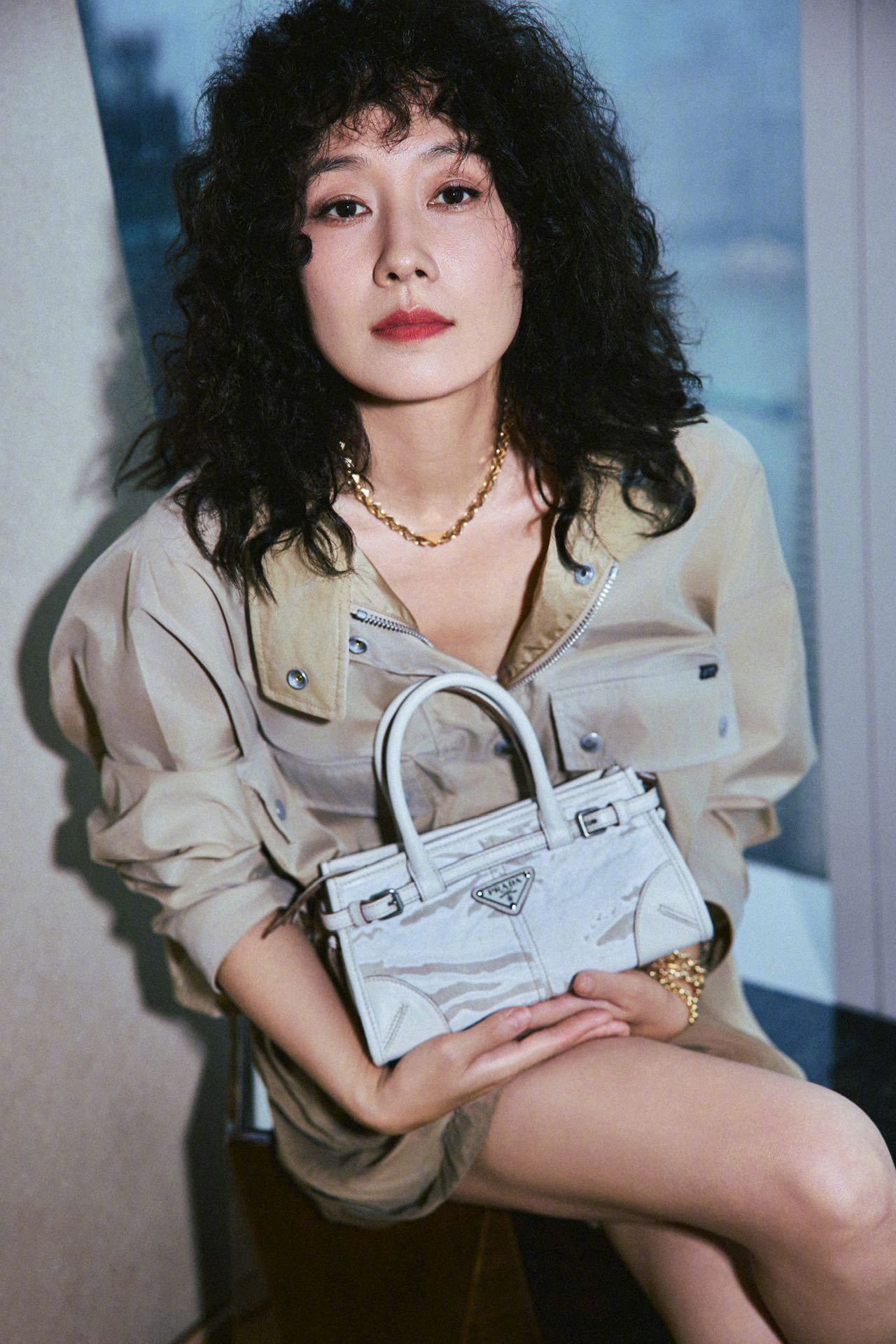 马伊琍身着Prada短裤套装,佩戴Prada精品珠宝Eternal Gold系列,手拎Prada Bonnie手袋,配搭一头爆炸卷,很复古的八、九时年代摩登造型。朱珠身着白色开衫和半裙,佩戴Prada精品珠宝Eternal Gold系列,清新娇媚,女人味十足!