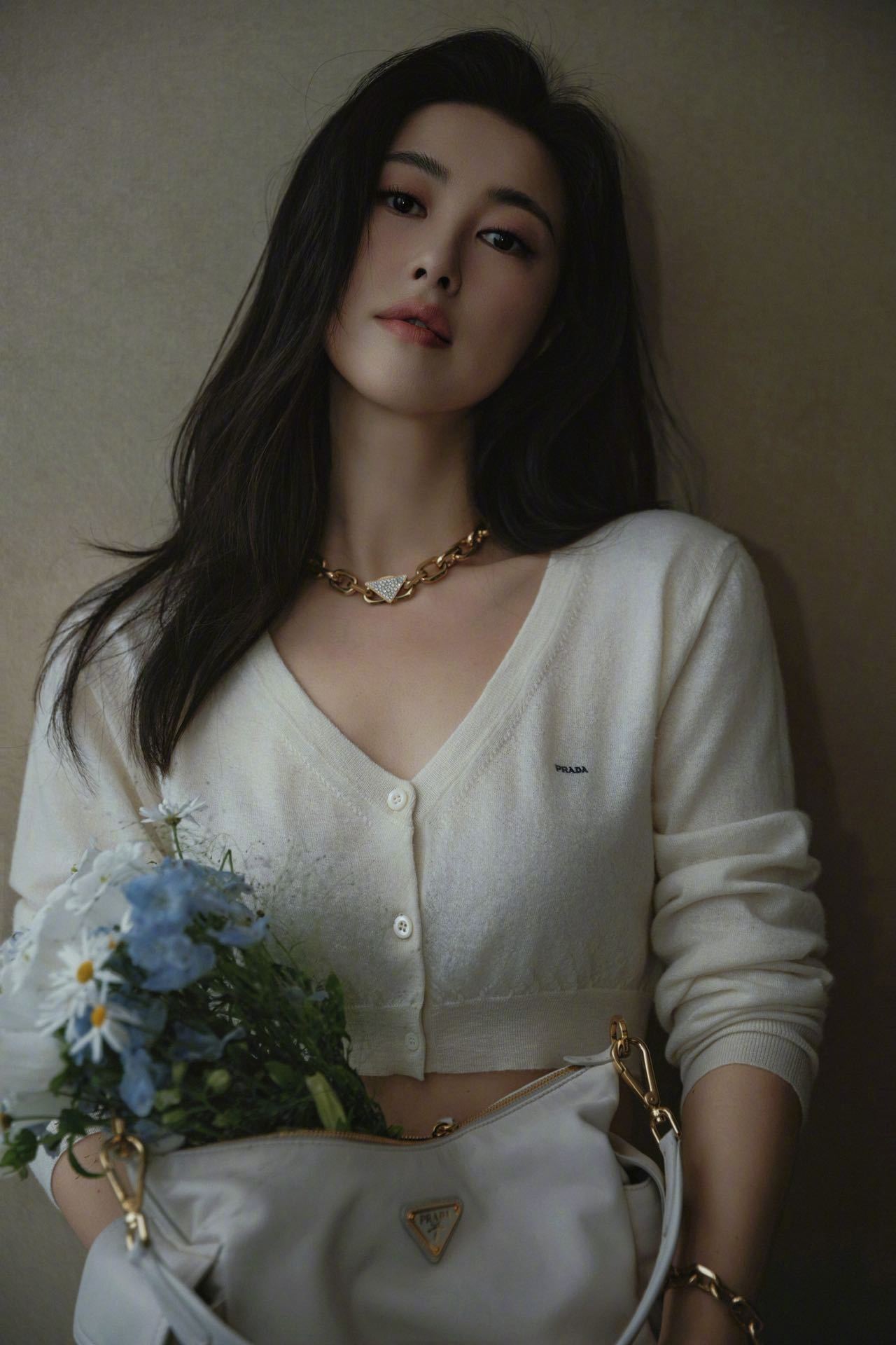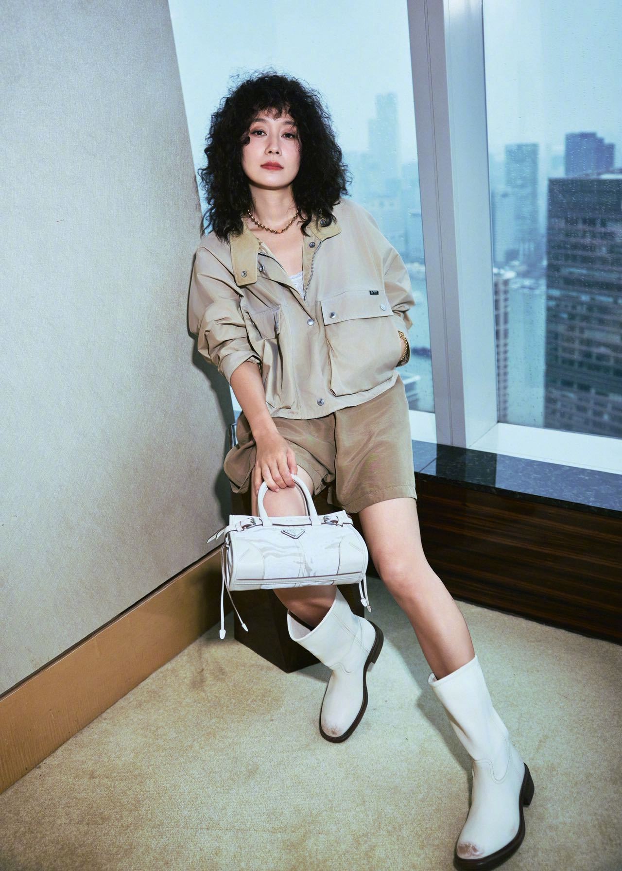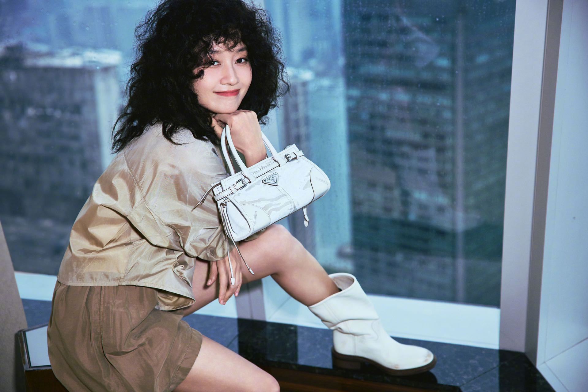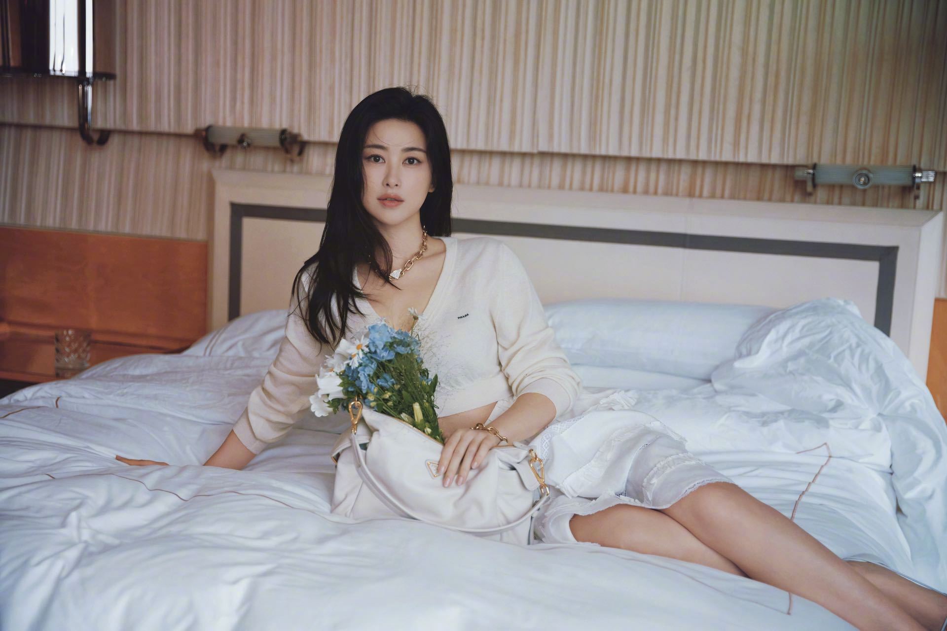 马伊琍身着Prada短裤套装,佩戴Prada精品珠宝Eternal Gold系列,手拎Prada Bonnie手袋,配搭一头爆炸卷,很复古的八、九时年代摩登造型。朱珠身着白色开衫和半裙,佩戴Prada精品珠宝Eternal Gold系列,清新娇媚,女人味十足!
