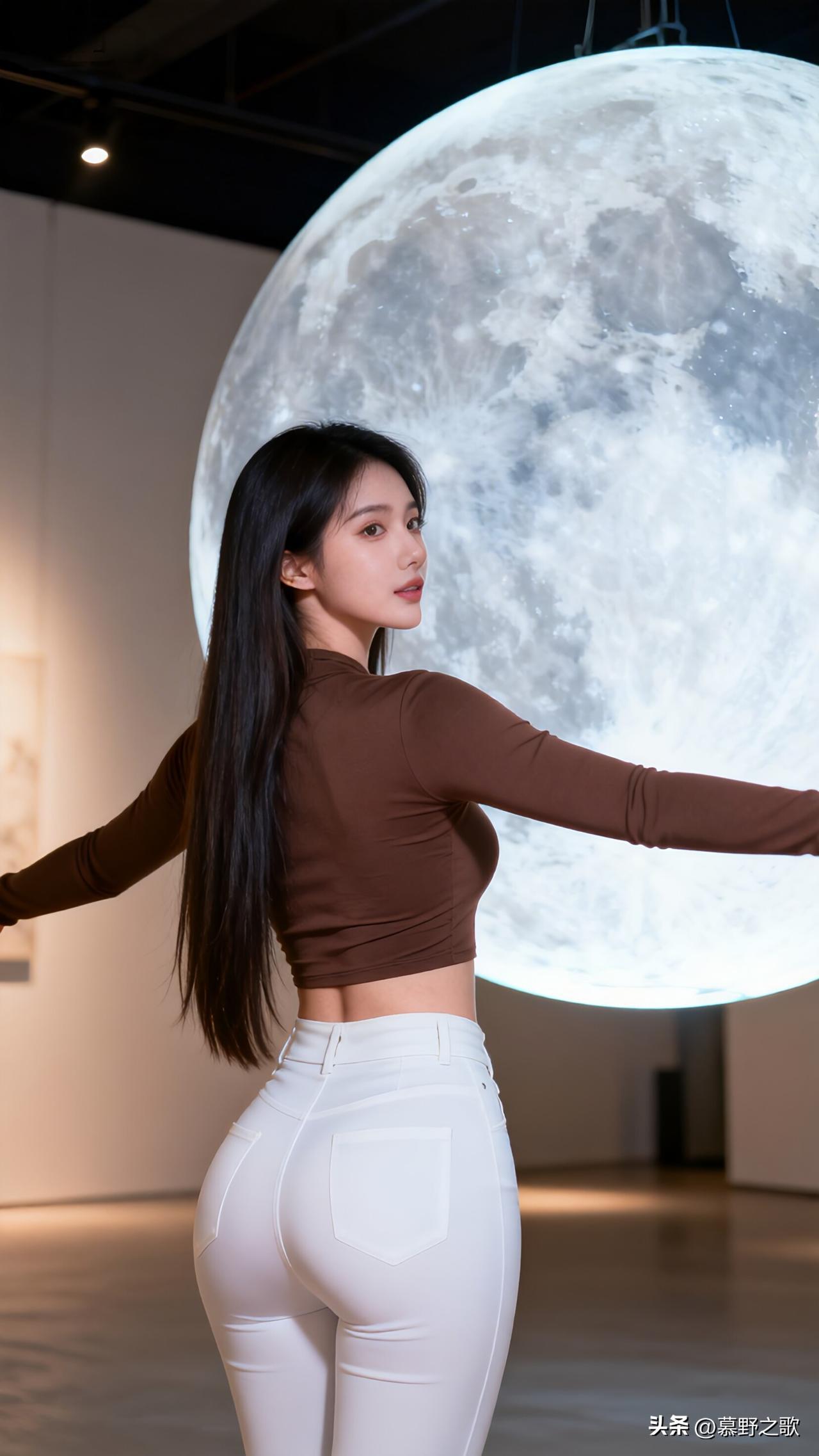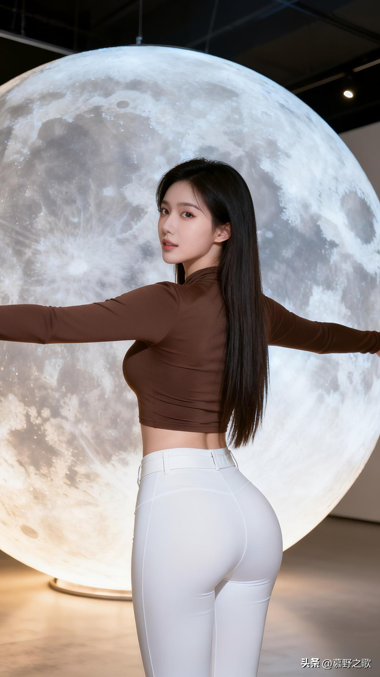 以月为幕,赴一场浪漫之约 巨型发光月球装置下,咖色短款高领上衣搭配白色高腰瑜伽裤,黑长直披肩发,双臂舒展回眸的瞬间,把清冷与性感拉满。 紧身款型勾勒身材曲线,大地色与纯白的碰撞,在月球柔光中自带故事感,是氛围感写真的绝佳范本。 氛围感穿搭 月球拍照 瑜伽裤穿搭