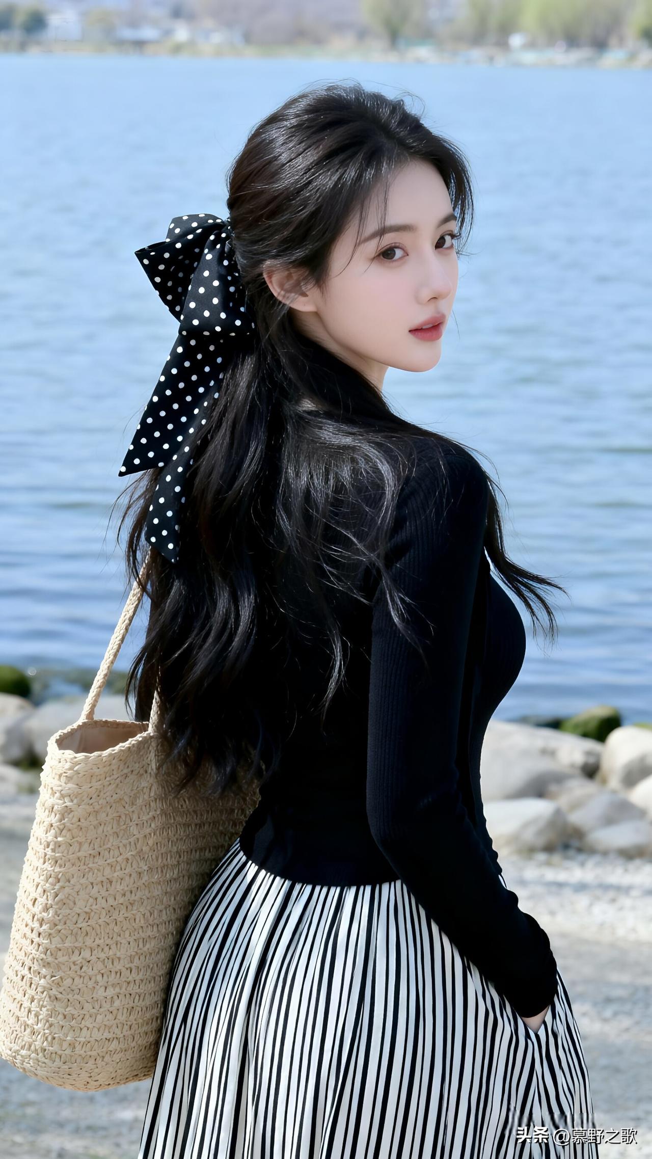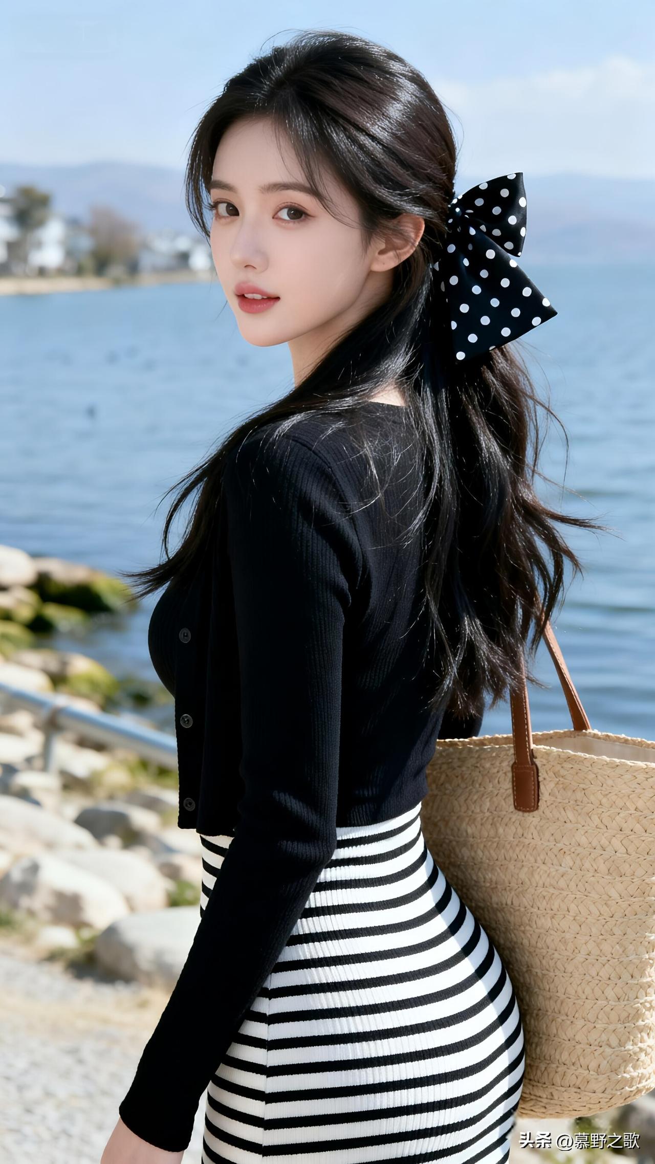 湖光里的法式温柔 湖畔边,黑色针织开衫搭配黑白竖条纹鱼尾裙,波点蝴蝶结发饰,草编托特包,把法式慵懒与优雅穿在了身上。 鱼尾裙勾勒腰臀比,波点元素注入复古感,湖光为背景,每一步都带着松弛的浪漫。 法式穿搭 鱼尾裙 湖畔拍照