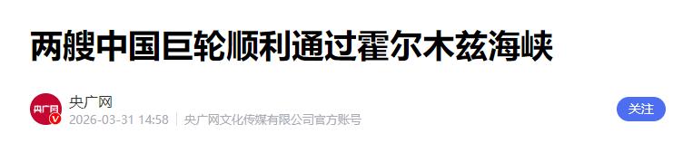中方两艘货船被拒绝通行后,全球各国等着看北京反应,伊朗突然改主意了!3月31日上午,在波斯湾滞留超过一个月的“中海北冰洋”号与“中海印度洋”号,顺利通过霍尔木兹海峡。这是自2月底冲突升级以来,中国大型船只首次穿越这一全球能源咽喉。 我们这两艘货船,“中海北冰洋”号和“中海印度洋”号,都是能装载约1.9万标准集装箱的超大型货轮,属于全球最大的集装箱船之一,原本计划在3月中旬从波斯湾出发前往马来西亚,结果因为冲突升级,只能滞留在波斯湾,一停就是一个多月。 3月27日,伊朗全面封锁海峡的当天,这两艘货船曾尝试靠近海峡入口,在接近伊朗拉腊克岛和格什姆岛附近时,被伊朗方面劝返了。 伊朗当时劝返这两艘货船,原因很明确,因为这两艘船之前在阿联酋和沙特的港口停留过,而在伊朗看来,这就触碰了他们的管控红线。毕竟当时伊朗的管控原则很清晰,就是要针对美以及其盟友,凡是和这些国家沾边的船只,都不允许通过海峡。 消息传出来后,全球各国都在密切关注,不少国家都在等着看北京的反应,有人猜测中国会不会因为货船被拦而采取强硬措施,也有人好奇中国会怎么协调这件事,毕竟霍尔木兹海峡关系到全球能源供应,中国作为大国,一举一动都影响着地区局势。 就在所有人都在观望的时候,伊朗突然改了主意,不仅允许这两艘中方货船通行,还为它们的通行提供了协助。其实伊朗的这个转变,并不是突然的决定,而是有明确原因的,每一点都符合实际情况,没有任何虚假成分。 首先,中国一直保持中立立场,自美伊冲突爆发以来,中国从来没有参与对伊朗的围堵和制裁,反而多次派出中东特使,积极斡旋,推动局势降温,还第一时间向伊朗派送了人道主义物资。 中国还先后和海湾地区几乎所有国家的外长通了电话,强调冲突应该尽快降温,尊重各国主权和国际法,这种负责任的态度,赢得了伊朗和海湾国家的信任。 其次,伊朗的管控本身就不是全面封锁,而是精准区分敌友。3月22日,伊朗外交部就向国际海事组织发布声明,明确了霍尔木兹海峡的通航规则:非敌对国家的船只,只要没有参与、没有支持针对伊朗的侵略行径,并且遵守安全规定,在和伊朗主管部门协调后,就可以安全通行。 伊朗外长还特意明确,海峡对伊朗的敌人保持关闭,但允许中国、俄罗斯、印度等友好国家的船只通过。3月30日,伊朗议会国家安全委员会还通过了海峡管理法案,进一步明确禁止美以以及对伊朗实施单边制裁的国家船只通过,而中国作为友好国家,自然在允许通行的范围内。 更重要的是,中国是伊朗最重要的合作伙伴之一,中国是伊朗及整个中东地区最大的石油买家之一,伊朗约80%到90%的原油出口,都要经过霍尔木兹海峡流向中国。 对伊朗来说,封锁中国船只,就等于切断自己最重要的经济来源,这对于长期处在西方制裁下的伊朗来说,显然不划算。所以,允许中方货船通行,也是伊朗的理性选择,既不会得罪中国这个重要伙伴,也能向国际社会展示自己的管控原则,避免被孤立。 3月30日傍晚,“中海北冰洋”号和“中海印度洋”号从迪拜附近海域起锚,沿着伊朗格什姆岛和腊克岛之间的航线,以约10.4节的航速,顺利通过了霍尔木兹海峡的狭窄出口,随后驶入阿曼湾水域,按照计划,这两艘船预计4月6日就能抵达马来西亚巴生港。 值得一提的是,3月31日下午,外交部发言人毛宁在例行记者会上也证实了这件事,她说经同有关方面协调,近日中方有三艘船舶过航霍尔木兹海峡,中方对有关方面提供的协助表示感谢,同时呼吁尽快停火止战,恢复海湾地区的和平稳定。 这件事看起来只是两艘货船顺利通行,但背后反映的是大国间的战略博弈和立场博弈。之前各国等着看北京的反应,其实中国从一开始就没有慌乱,也没有采取极端手段,而是始终坚持中立,通过正常的外交协调,妥善解决了问题。 这既体现了中国的大国担当,也证明了中国的影响力——我们不搞霸权,不主动挑起冲突,但也能凭借自己的立场和实力,保障自身的合法权益。 很多人可能没意识到,这两艘货船的通行,其实也向国际社会传递了一个明确的信号:中国始终坚持独立自主的和平外交政策,在复杂的国际局势中,既能维护自身利益,也能积极推动局势降温,为世界和平与发展贡献力量。 而伊朗的选择,也让大家看到,在国际博弈中,区分敌友、坚持理性,才是最有利于自身发展的选择。 和之前太原舰遭遇美舰挑衅时的冷静应对一样,这次中方货船滞留事件的妥善解决,也让世界看到了中国的冷静和专业。 我们不惹事,但也不怕事,无论是海上遭遇挑衅,还是货船被拦滞留,中国都能凭借自己的实力和智慧,从容应对,维护好自身的合法权益。
