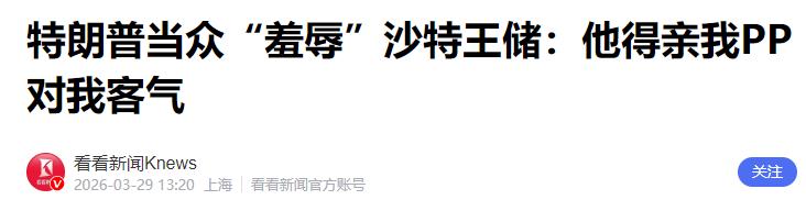 沙特王储穆罕默德·本·萨勒曼(MBS)回应特朗普所谓“亲我的屁股”的话,说沙特“将不再购买美国武器”。 事情发生在2026年3月27日,迈阿密举办的沙特主权财富基金年度投资论坛上,台下坐着不少沙特投资者,还有国际上的商界大佬,特朗普作为嘉宾上台发言,本来一开始还夸沙特国王了不起,说自己和沙特关系很铁,可话锋一转,就开始编起了他和沙特王储穆罕默德·本·萨勒曼(MBS)的“私下对话”。 他模仿王储的口吻说,王储曾感叹一年前美国还是个要完蛋的国家,现在却成了全世界最炙手可热的地方,紧接着,他补了一句让全场都惊呆了的话:“他没想到会变成这样,他没想到自己得亲我的屁股,他真的没想到。” 这话一出口,台下一片尴尬,要知道,沙特可是海湾地区的大国,是石油输出国组织的领头羊,而MBS是沙特实际的掌权人,个性极强,平时在国际场合都是别人对他客客气气,如今却被自己的“盟友”美国总统,当着全世界的面用这种粗鄙的话羞辱,换谁都受不了。 而且这不是AI恶搞,也不是断章取义,视频传遍了全世界,明明白白就是特朗普亲口说的,他甚至还补了一句,让王储最好对他好一点,必须对他客气。 特朗普为什么敢这么嚣张?其实当时的背景很关键,就在他说这番话的同一周,美国和以色列正在对伊朗发动军事行动,伊朗的导弹和无人机不断袭来,而沙特虽然没直接出兵,却已经被卷了进去。 伊朗的导弹甚至落在了沙特境内,击中了美军驻沙特的基地,沙特的水厂、油田也都在伊朗导弹的射程之内,全国七成的饮用水靠海水淡化厂,一旦被炸毁,几百万人口的城市几天之内就会没水喝,石油更是沙特经济的命脉,所以沙特当时比谁都希望美国能彻底压制伊朗,也比谁都害怕自己先被伊朗报复。 也正因为这样,在特朗普羞辱王储之前,MBS还在私下多次游说特朗普,让他把对伊朗的军事行动进行到底,甚至说这是“历史性的机遇”,只有彻底推翻伊朗政权,沙特才能高枕无忧。 可特朗普心里门儿清,沙特是有求于自己,所以才敢当众羞辱,说白了就是他一贯的“交易式外交”,觉得你有求于我,就得低头,就得受着,根本不管什么盟友情谊,也不管什么外交礼仪。 更离谱的是,就在说这番羞辱的话几分钟后,他又换了一副嘴脸,夸MBS是“勇士”,说他和美国“并肩作战”,翻脸比翻书还快。 一开始,沙特选择了沉默,不是不想反击,是没办法,毕竟当时还需要美国的保护,可沉默不代表妥协,MBS作为沙特的掌权人,从来不是会忍气吞声的人。 很快,MBS就针对特朗普的羞辱作出了回应,态度明确且坚决,直接表示,沙特将不再购买美国武器,这句话一出,整个国际社会都震动了,而特朗普最在意的千亿级武器市场,瞬间就泡汤了。 沙特一直是美国军火最大的买主之一,双方之前签过不少大额军售协议。2025年5月,美国和沙特就签署了价值近1420亿美元的军售协议,这也是史上最大的军售协议之一,这笔协议还是沙特向美国投资6000亿美元一揽子协议的一部分。 到了2026年1月,美国国务院又批准了一项对沙特的军售方案,光是730枚“爱国者”导弹及其相关设备,总价值就达到90亿美元。 除此之外,还有不少正在谈判的武器订单,加起来足足有数千亿美元,而特朗普的一句羞辱,直接让这些订单全部告吹,沙特明确表态不再购买美国武器,等于直接断了美国军火商的一条财路。 其实这一切都是特朗普自己造成的,他以为当众羞辱盟友就能彰显自己的强势,就能让对方低头,殊不知这恰恰暴露了他的粗鄙和短视。 说到底,美国和沙特的关系,从来都没有真正的盟友情谊,只有利益交换,特朗普破坏了这种利益平衡,自然就要付出代价。数千亿美元的损失,不是一笔小数目,不仅会影响美国的军火行业,还会影响美国的经济发展,而这一切,都是特朗普自己一手造成的,怨不得别人。