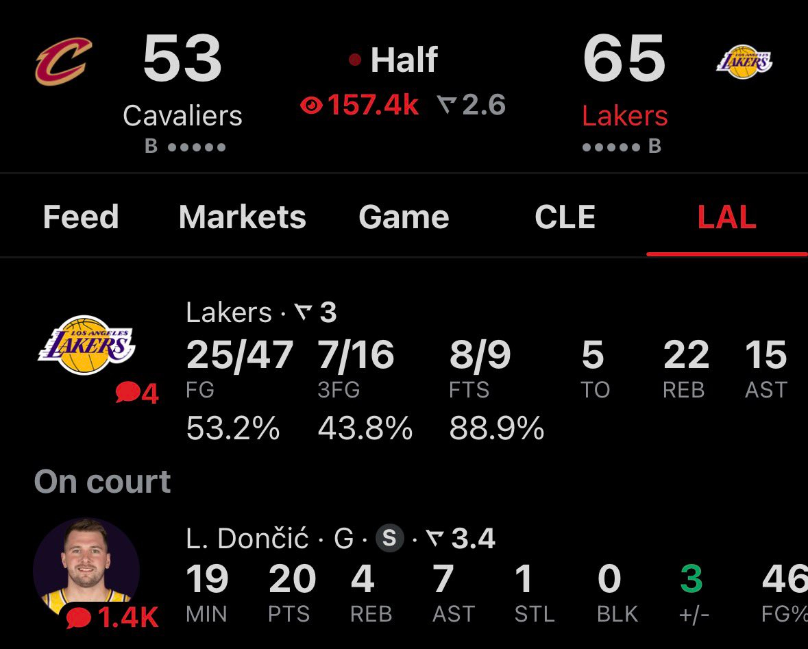 半场结束,其实53-65湖人湖人从落后到反超12分,下半场加油!东契奇开场手感不佳,但半场也拿20分4篮板7助攻了夯夯维亚也超拼👍洛杉矶湖人骑士vs湖人东契奇