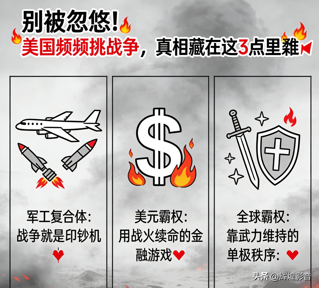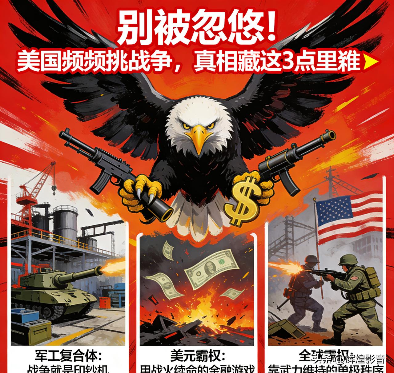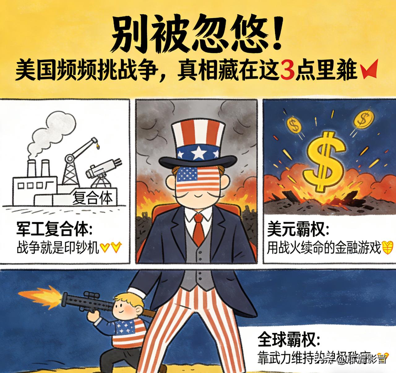 别被忽悠!美国频频挑战争,真相藏在这3点里🔥 别再被“民主”“反恐”的幌子骗了!美国频频在全球挑起战争,从来不是为了所谓和平,而是一场处心积虑、只为自身牟利的利益收割。 一、军工复合体:战争就是印钞机💸 2026财年美国军费直接飙升至9010亿美元,这个数字远超全球其他国家军费总和,背后是军火商、军方、政客牢牢绑定的利益链条。 他们形成了“发动战争—拿到天价军火订单—推动扩军再开战”的闭环,每一场战火燃起,都是军火商赚得盆满钵满的时候。 当年对伊开战仅一个月就耗资超120亿美元,后续追加的数千亿预算,最终尽数流入军工巨头的口袋,战争对他们而言,就是最暴利的生意。 二、美元霸权:用战火续命的金融游戏💰 美国四处发动战争,核心目的之一,就是死死守住石油美元这一金融霸权根基。 只要全球石油交易依旧用美元结算,美国就能靠印钞收割全世界财富。而战争会制造全球局势动荡,逼迫各国资本疯狂回流美国,既能稳住美元地位,又能稀释自身高达几十万亿美元的债务压力。 但凡有国家敢挑战美元结算体系,美国就会举起战争大棒,这是它维护金融霸权的野蛮手段。 三、全球霸权:靠武力维系的单极秩序⚔️ 美国挑起战争,更是为了巩固自己的全球霸主地位,维系不公平的单极世界秩序。 它在中东、亚太等热点地区扶持代理人,发动局部战争,围堵遏制新兴大国发展,控制关键战略通道,把全世界都当成自己的势力范围。 嘴上喊着国际规则,实则奉行“美国优先”,用军事强权逼迫全世界顺从它的意志,全然不顾地区民众的生死与全球和平稳定。 美国的战争,从来没有正义可言,满盘皆输的只有饱受战火摧残的普通民众,获利的永远是美国的利益集团。 它用华丽谎言包装野蛮掠夺,用漫天战火收割全球利益,这套霸权把戏,早该被全世界看清。 点赞转发,让更多人戳穿美国战争的虚伪面具! 你认为美国这种靠战争牟利的霸权行径,还能维持多久?欢迎在评论区分享你的观点,点击头像查看更多国际热点解读。👇 👉美国为何频频挑起战争美国战争真相 全球霸权 美元霸权