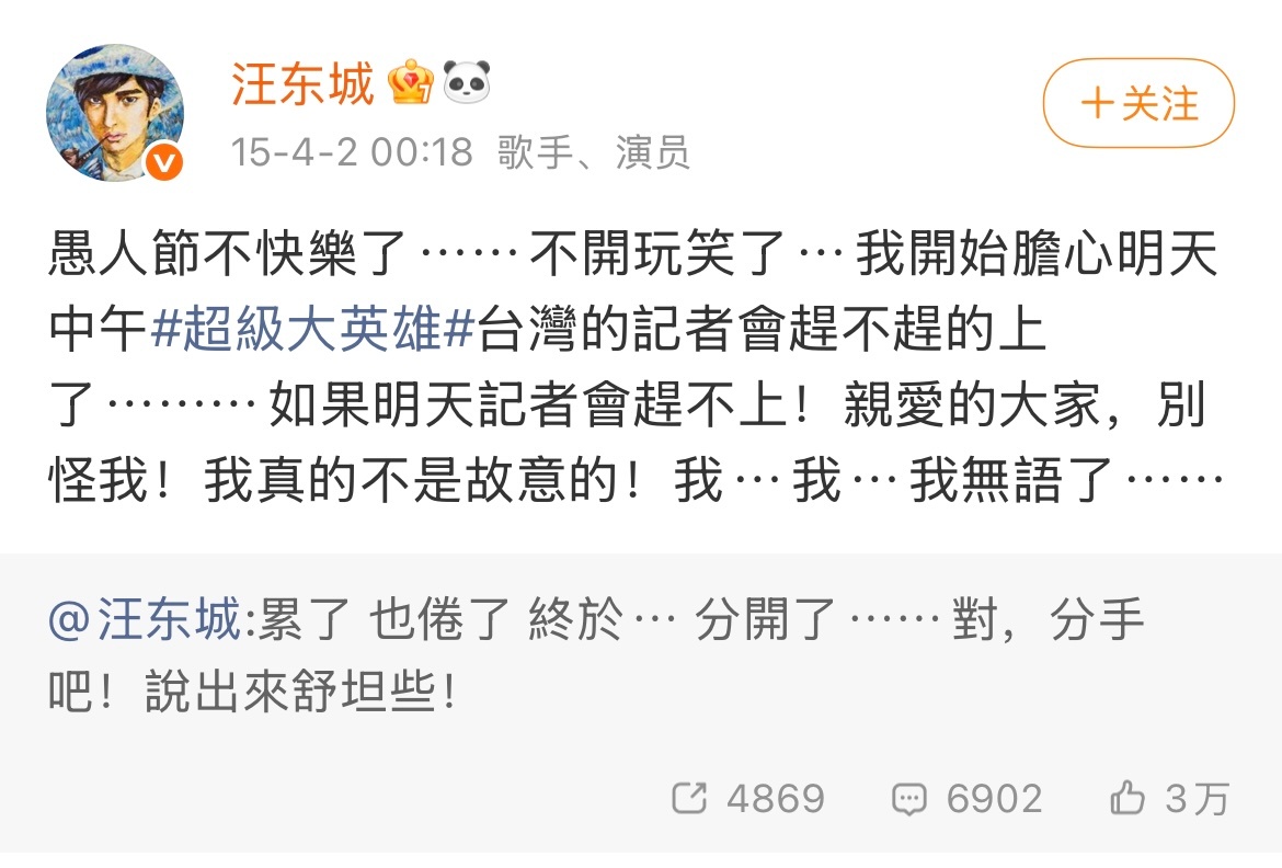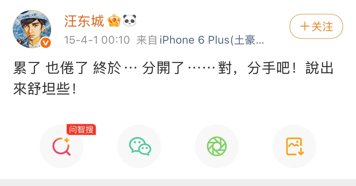 汪东城五年愚人节官宣恋爱 汪东城之前的愚人节发的都是“恋爱”官宣而且是连续五年今年直接换新套路,嗯…这怎么不算一种“为爱退圈”汪大东你怎么还这么好玩,能不能有点大人样👉🏻👈🏻 汪东城愚人节退圈
