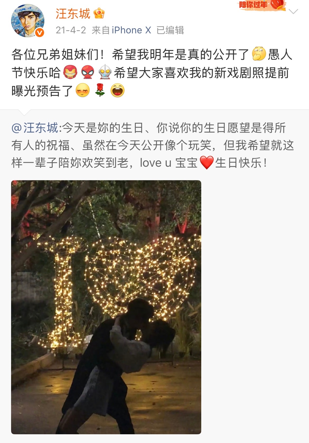 汪东城五年愚人节官宣恋爱 汪东城之前的愚人节发的都是“恋爱”官宣而且是连续五年今