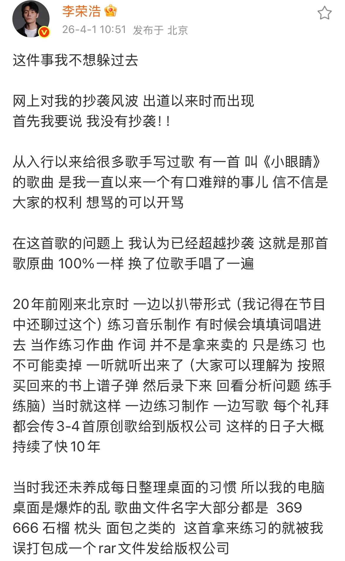 李荣浩对小眼睛最生气的点 李荣浩发声明回应《小眼睛》抄袭其中提到 刚出道时还有一