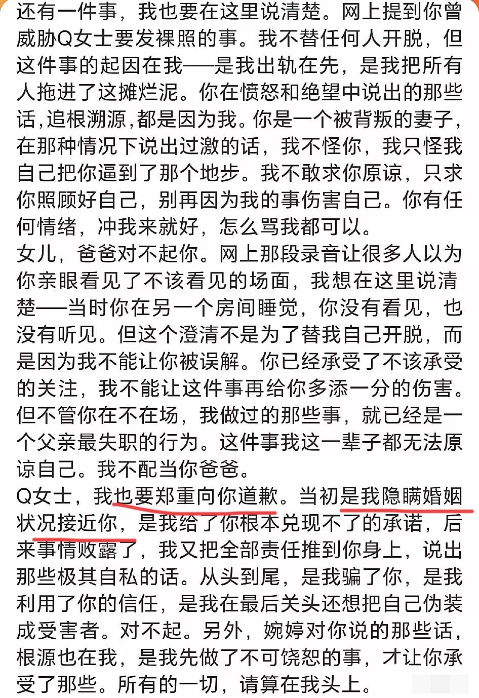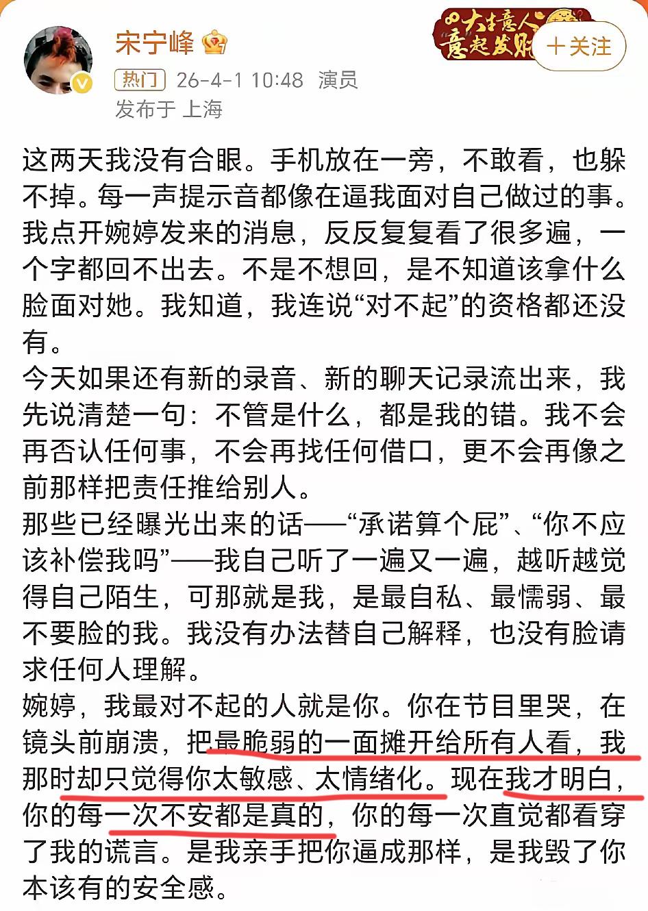 虽然出轨的是宋宁峰,但现在最崩溃的应该是张婉婷,估计她已经碎了。 在宋宁峰的道歉信里明确说张婉婷在节目里哭是情绪化所致,很难想象那个时候她是用怎样的心情,鼓起多大勇气才跟宋一起参加这档节目。 那时候大家都不理解她,以为她是个疯子,对比黄圣依的情绪稳定,她简直就是情绪黑洞。 时间终于给出了答案,也让人慢慢看清了这里面的细枝末节,也终于理解了她。 试想哪个女人在结婚之初不是深爱对方才决定结婚的,但宋宁峰却永远理解不到她的情绪,甚至在夫妻之间有裂痕的时候不主动修复,而是选择出轨逃避。 别说现在是舆论满天飞,就算是普通夫妻面对老公的不忠,妻子带着孩子也是很无力吧,真心希望她早点走出这最艰难的时刻。