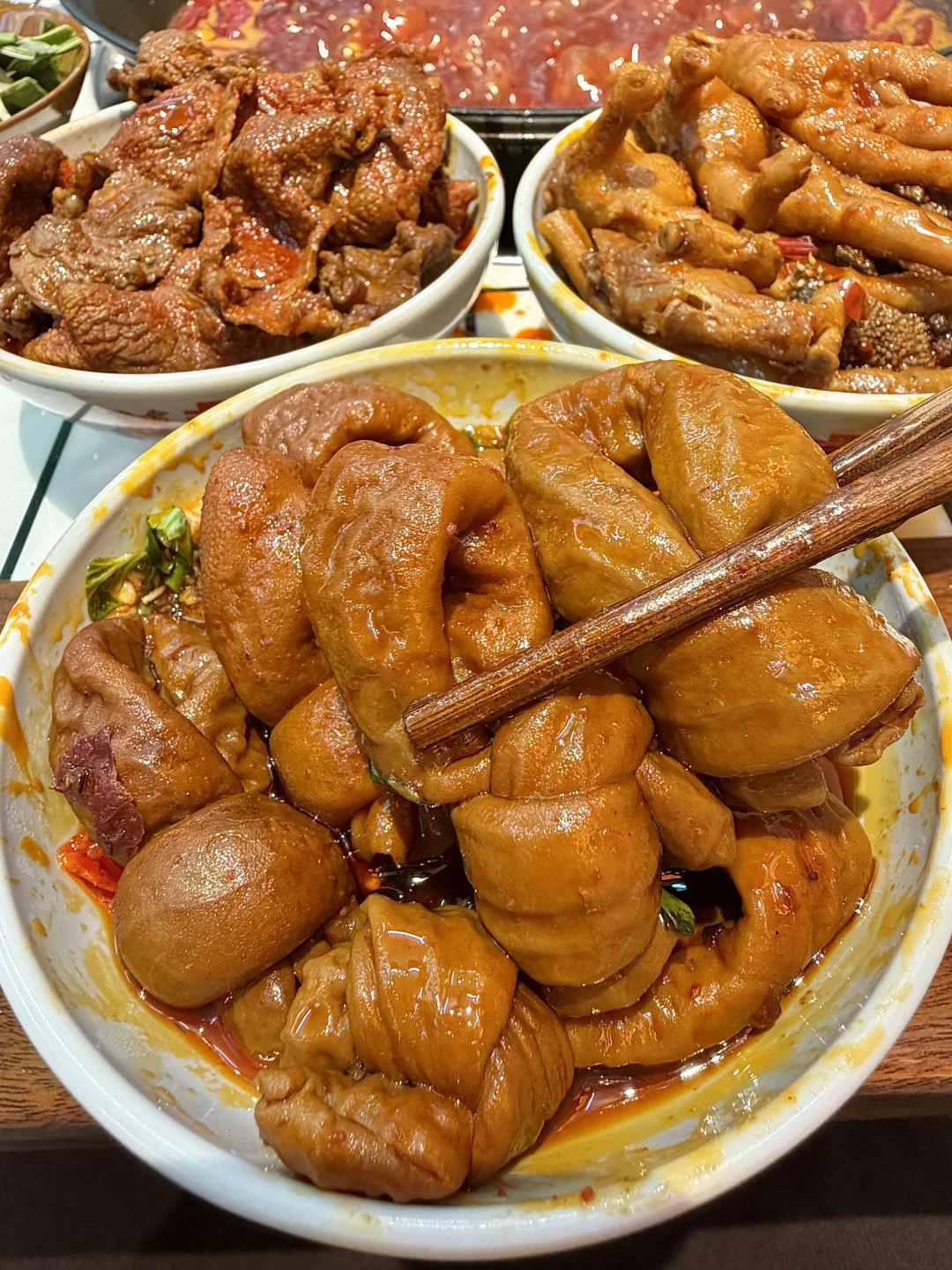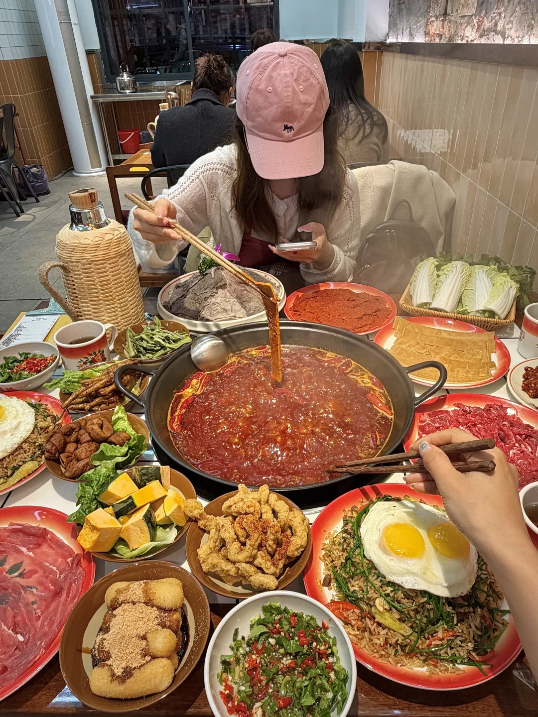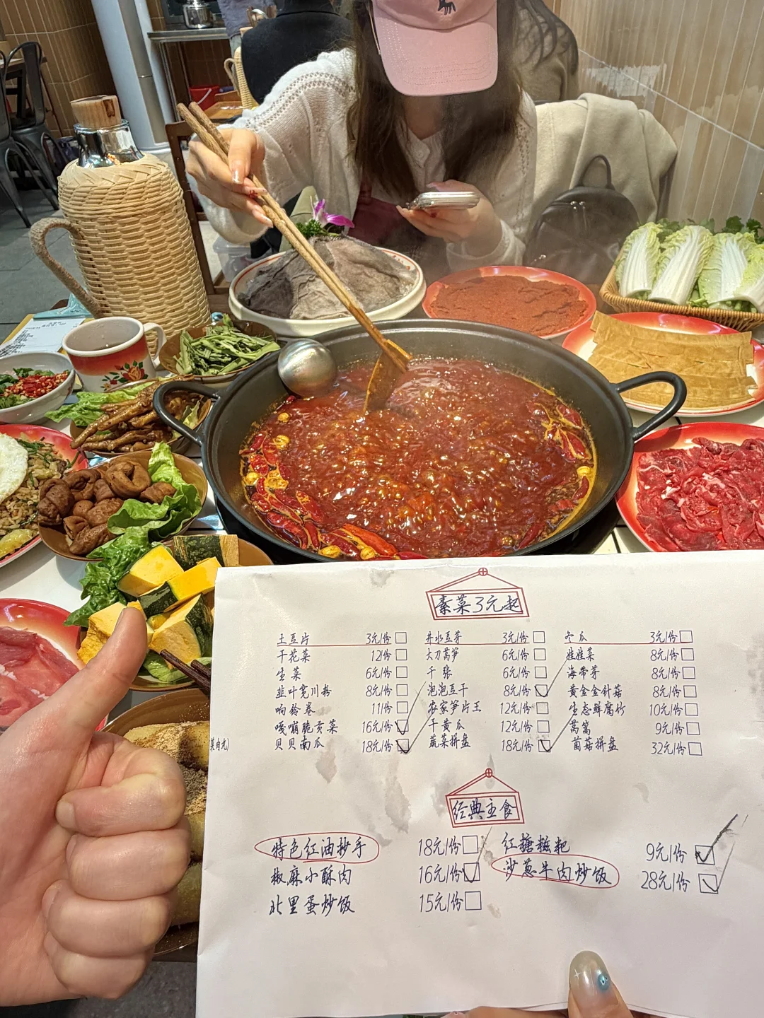 果然要听本地人的推荐!真的名不虚传 值得我为它坐20站地铁来!!! 不是路边随便找的店子,开了好多年的老店,虾滑宽面、纸皮烧麦、沙葱牛肉炒饭……都好地道!好好吃!! 素菜3r,荤菜10r!还有重庆红油锅底,感觉涮啥都嘎嘎香,推荐肥肠结、鸡爪、牛肉,盲点都不会踩雷 📍 记住这个位置:北里重庆火锅