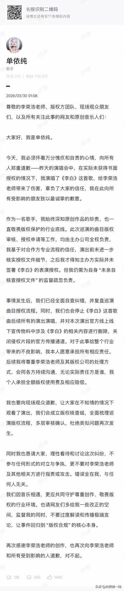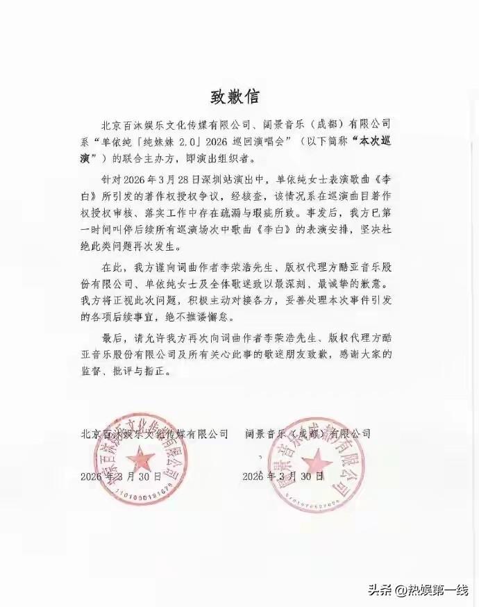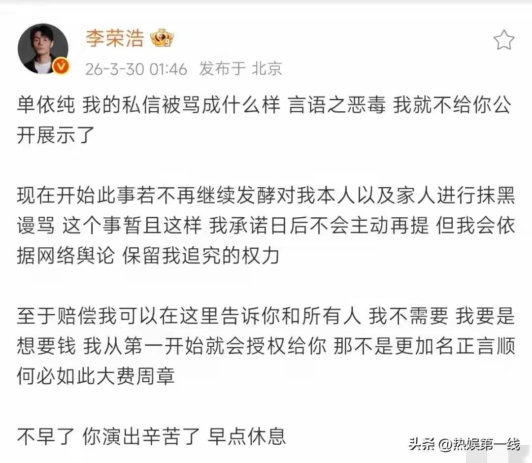 48小时紧急退票!从“翻唱翻车”到全额赔偿,单依纯这回交的“版权学费”太贵了! 谁能想到,一场本该万众瞩目的巡回演唱会,竟然因为一首翻唱歌曲,变成了全网围观的“版权普法现场”?3月30日晚,百沐娱乐一纸公告,给单依纯武汉、郑州站的歌迷开了个“48小时无损退票”的口子。这哪是退票啊,分明是给所有想走捷径的娱乐圈人上了一堂价值不菲的公开课! 说实话,看完这事儿我心里五味杂陈。单依纯作为新生代实力唱将,本该是“版权意识”的模范生,结果却栽在了“信任主办方”这五个字上。虽然她在长文中诚恳道歉,甚至表示个人承担全额赔偿,但这种“无心之失”造成的信任裂痕,恐怕比金钱损失更难修复。这不仅是她个人的职业危机,更是给整个演出行业敲响了警钟:流量和口碑再高,也抵不过对规则的敬畏。 这事儿最让人动容的,其实是李荣浩的态度。面对粉丝的“网暴”私信,他一句“我不需要赔偿,我要是想要钱当初就会授权”,直接把格局拉满。在这个流量为王的时代,能有创作者为了原则放弃变现,真的很难得。单依纯虽然这次犯了错,但能遇到这样一位愿意给新人改错机会的前辈,也算是不幸中的万幸。 娱乐圈没有捷径,尊重原创才是最大的捷径。希望这次风波过后,我们能看到一个更懂规矩、更成熟的单依纯。 对于李荣浩这种“不收赔偿”的做法,你们觉得是大度还是纵容?