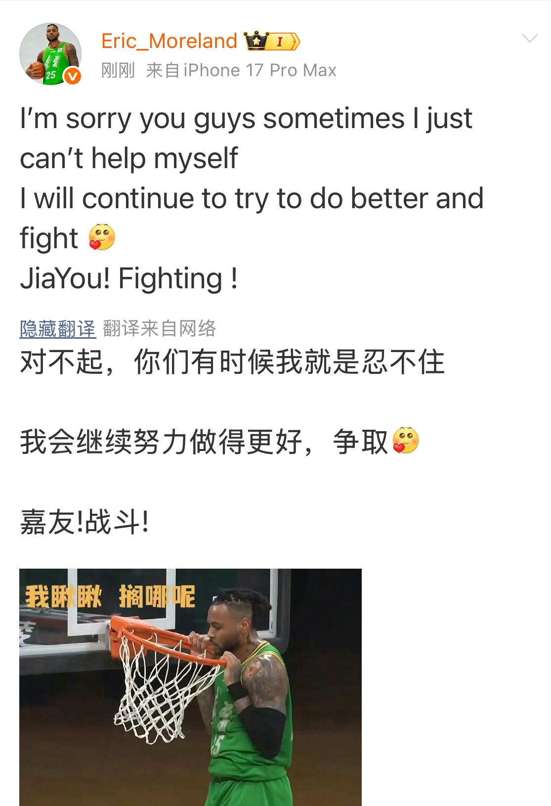 外援莫兰德发文向大家“道歉”了,说自己有时候就是忍不住,但会努力做得更好! 4月1日晚,莫兰德在个人社交平台发文,就自己在比赛中因亲吻篮筐被判罚技术犯规一事向大家道歉,他说,对不起了,自己有时候就是忍不住,今后会继续争取做得更好,加油!原来他在今晚辽宁本钢男篮对阵新疆男篮的比赛中,在一次扣篮成功后竟随即亲吻了一下篮筐,结果受到技术犯规的处罚。要说起来,这莫兰德的确是太喜欢搞笑了,像这种在比赛中亲吻篮筐的事情应该没有第二个人了吧!相信大家也不会批评他的,毕竟能够给大家带来快乐也是一件很好的事情吗?加油,莫兰德,继续保持良好状态,争取得分、整活两不误!
