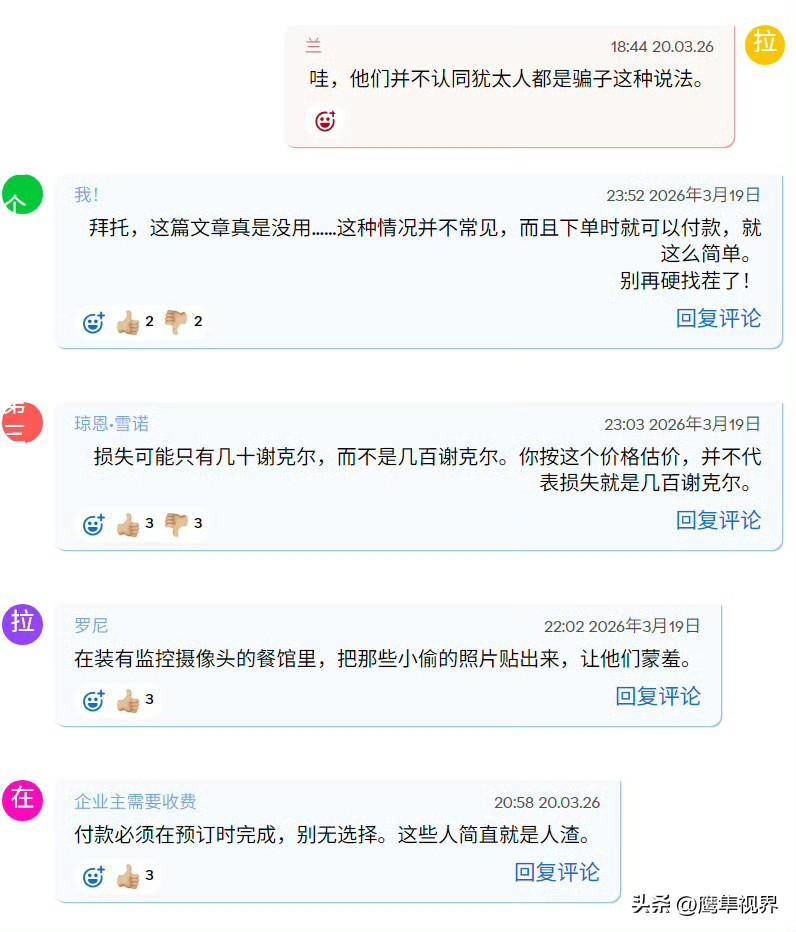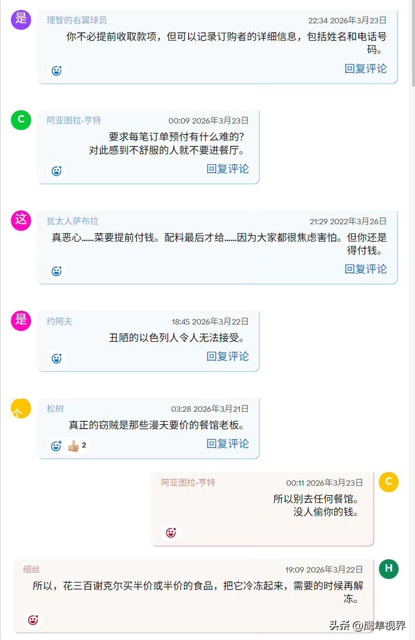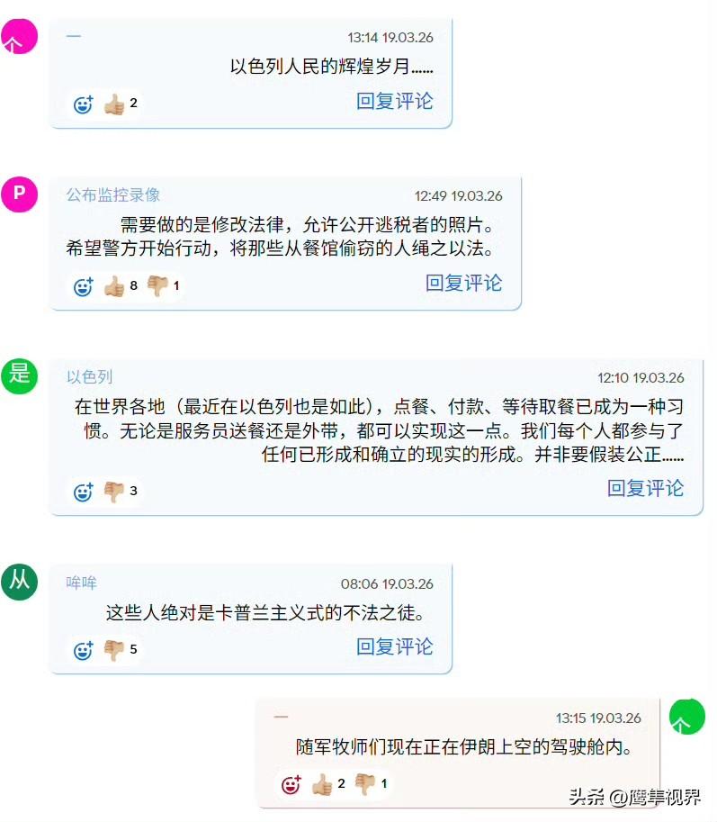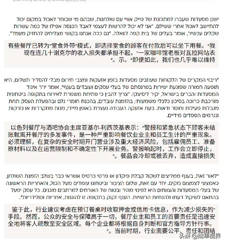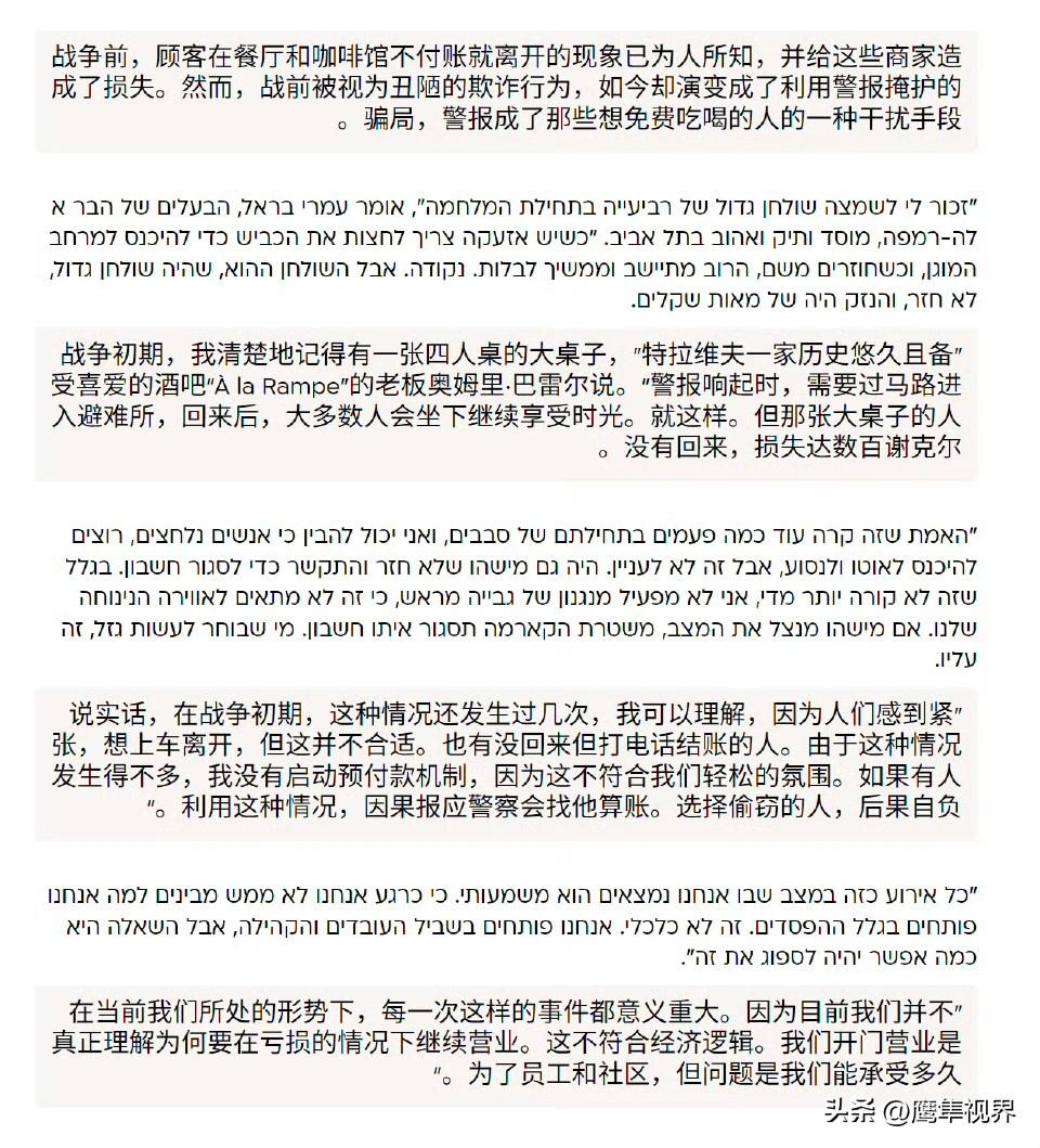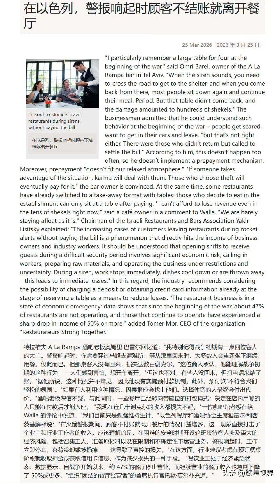 以色列瓦拉新闻网 Walla 报道:“在以色列,战争前顾客在餐厅和咖啡馆不付账就离开的现象已为人所知,并给这些商家造成了损失。然而,战前被视为丑陋的欺诈行为,如今却演变成了利用警报掩护的骗局,警报成了那些想免费吃喝的人的一种干扰手段。一些以色列人会去餐馆用餐,等着导弹来袭。一旦警报响起,他们就会逃之夭夭,以此来逃避支付账单。这种现象愈演愈烈,许多以色列餐馆老板为此苦不堪言,呼吁以色列相关部门出台解决方案。一些餐厅已经转向带座位的打包模式:决定在店内用餐的人只能在付款后才能入座。 ‘我现在连几十谢克尔的收入都损失不起’,一位咖啡馆老板在给 Walla 的评论中说道。‘我们目前只是勉强维持生计’。以色列餐饮业正处于经济紧急状态:数据显示,自战争开始以来,约 47%的餐厅停止营业,而继续营业的餐厅收入也急剧下降了 50%或更多。”