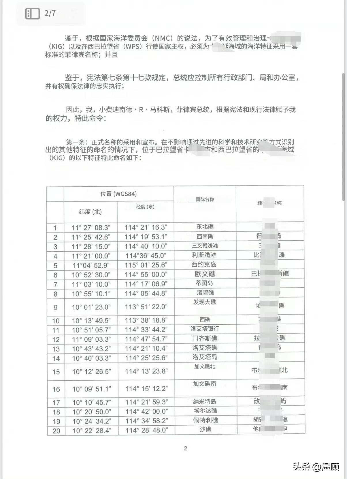 菲律宾总统小马科斯签署第111号行政命令,单方面非法更改中国南沙群岛131处岛礁