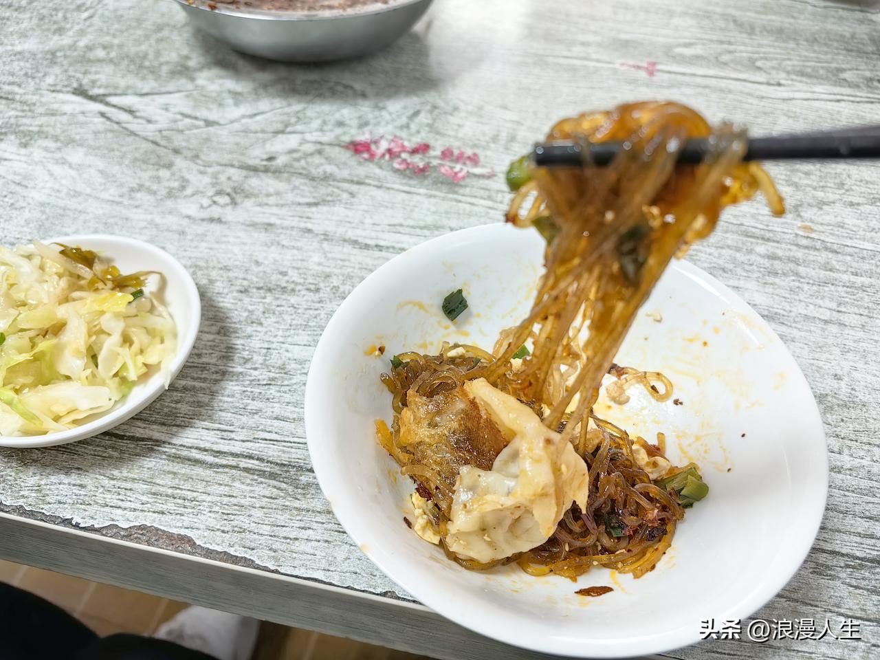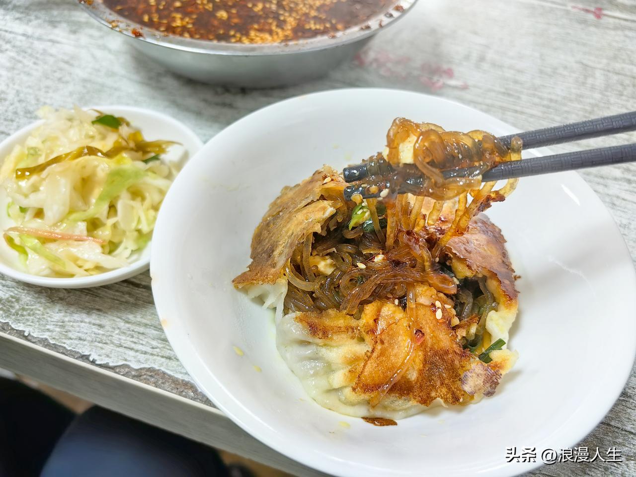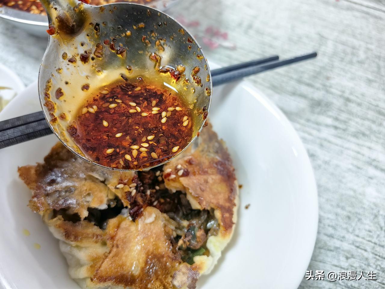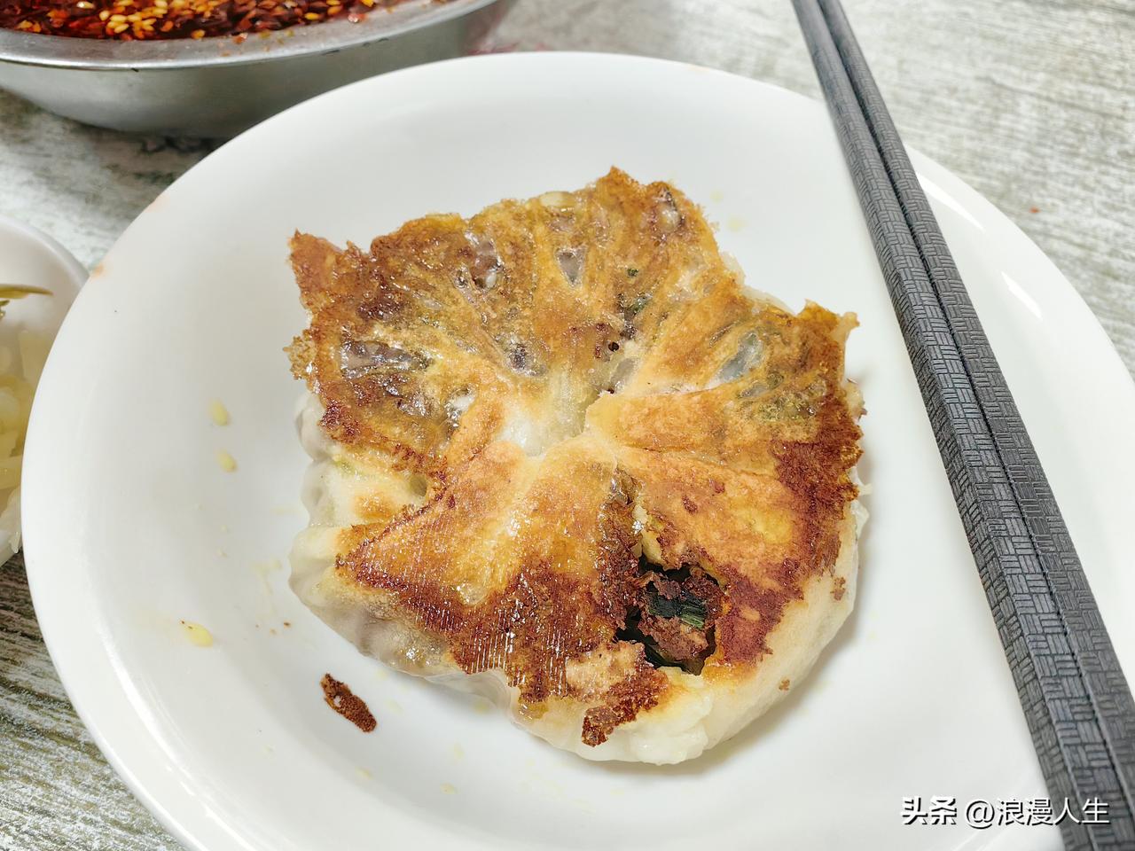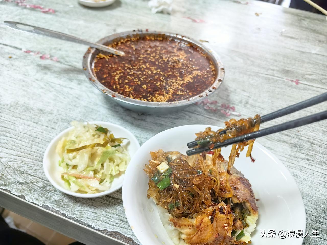 商洛市的水煎包味道真的是[赞],先后吃了录录包子(蒸熟的),排队的鲜肉包(小笼蒸熟),南家水煎包,心里话水煎包味道是最好吃的,包子皮薄隐约可透视馅料,背面金黄酥脆,用筷子扒开,馅料主要是粉条,少量韭菜,豆腐,粉条像玉一样透亮晶莹,吃起来软糯浓香,韭菜鲜味十足,豆腐很有嚼劲,再浇一勺辣子水,真的是香迷糊了,这家的辣子水真的是香味儿好过录录包子两倍不止。 改天我还要去商洛,上次去由于要品尝几家包子,所以只吃了一个水煎包,现在回味起来都有点遗憾,吃少了。 商洛等着我!