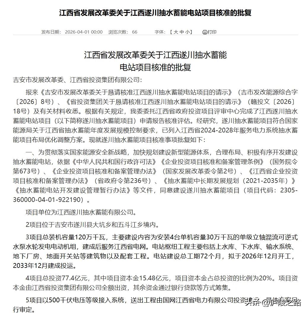 好消息,吉水遂川抽水蓄能电站,获省发改委批复。 遂川抽水蓄能电站项目位于吉安市遂川县大坑乡和五斗江乡境内,项目总装机容量120万千瓦,主要建设内容为安装4台单机容量30万千瓦的单级立轴混流可逆式水泵水轮发电电动机组,建成后服务江西省电网。