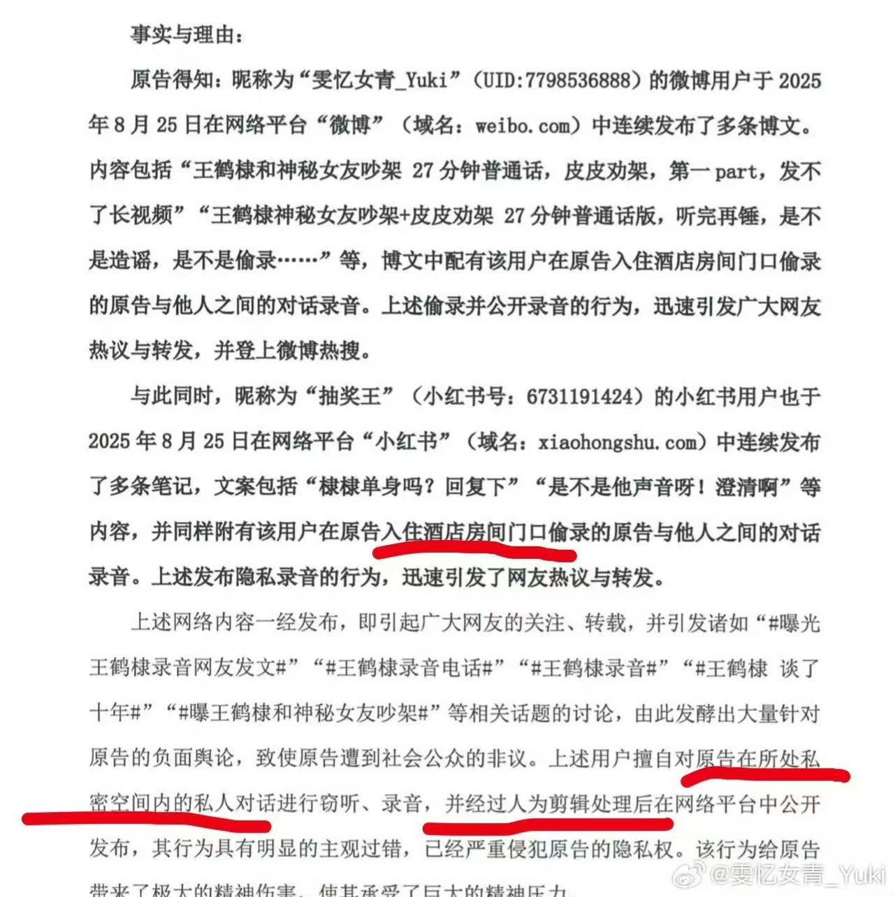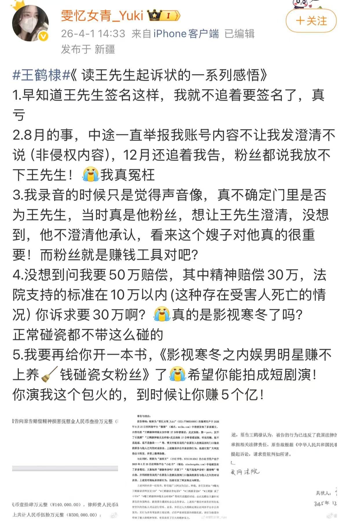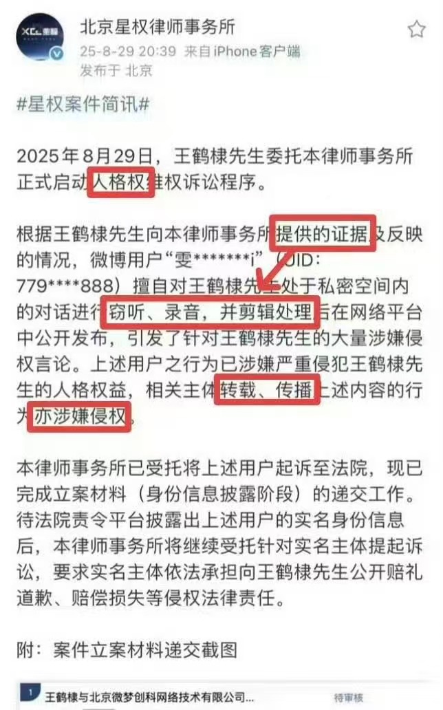 律师解读王鹤棣起诉录音 律师解读王鹤棣起诉 王鹤棣起诉私生录音事件迎来判决,私生发长文回应解读道:在案件审理过程中,当事人单方面、选择性、附带主观倾向地公开尚未审结案件的材料,并发表诸如“不怕”、“要钱”等定性言论,我认为,这种行为已超出一般诉讼参与或舆论回应的范畴。