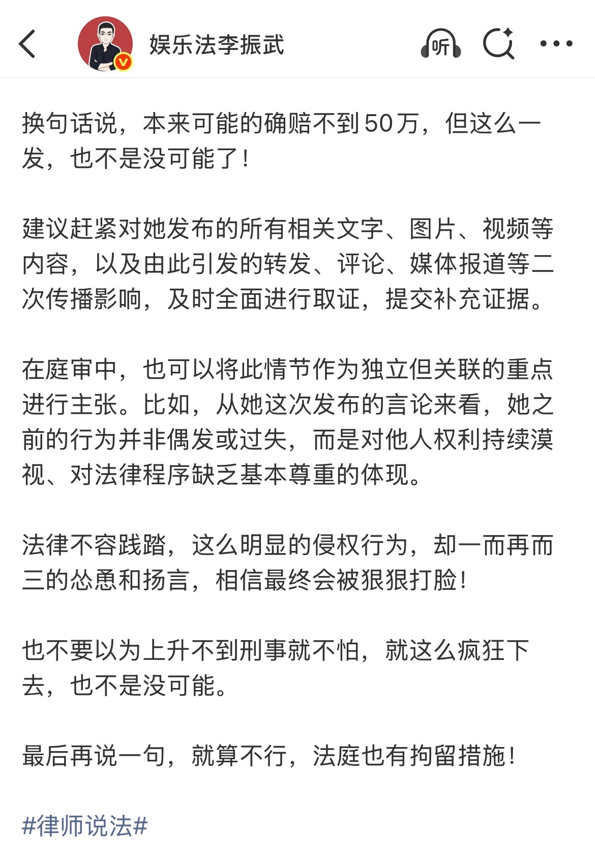 在庭审中,也可以将此情节作为独立但关联的重点进行主张。比如,从她这次发布的言论来看,她之前的行为并非偶发或过失,而是对他人权利持续漠视、对法律程序缺乏基本尊重的体现。