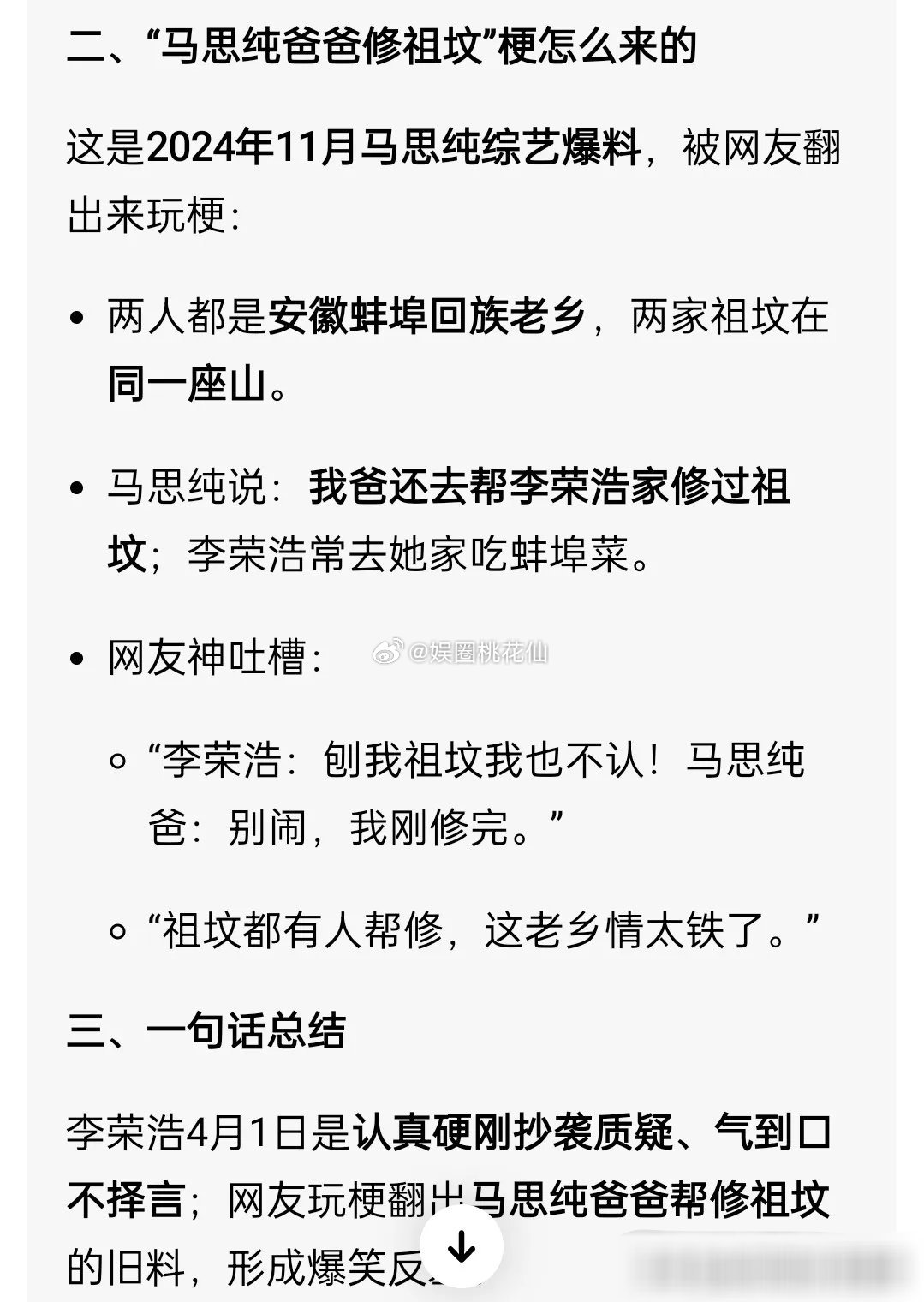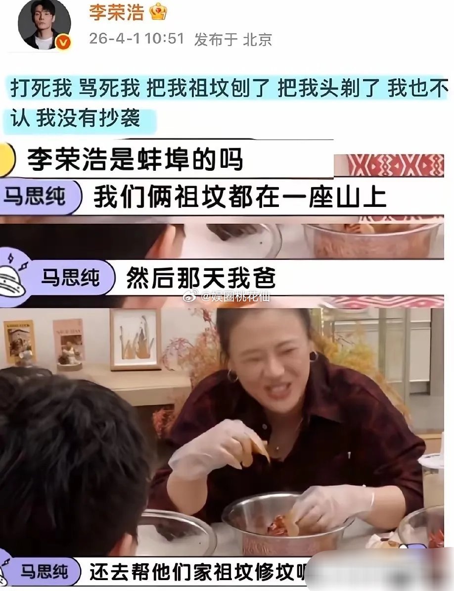 李荣浩这哪是过愚人节,分明是急眼了直接放狠话!直言就算被打死、骂死,甚至被刨祖坟、剃光头,也坚决不承认抄袭,情绪激动到口不择言。结果网友脑洞大开,压根没聚焦抄袭争议,聊着聊着竟扒出个意外梗——李荣浩家的祖坟是马思纯爸爸帮忙修的!这走向也太离谱了,网友纷纷玩梗调侃:马思纯爸爸在线喊话,别闹,刚修好没多久!好好的争议话题突然拐到祖坟上,剧情比歌曲还抓马,简直笑到停不下来。