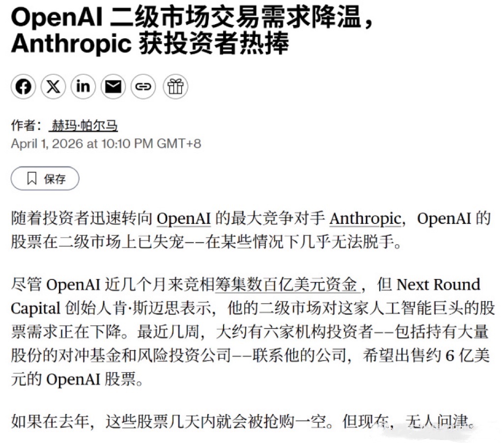 *随着Anthropic股价飙升,OpenAI在二级市场的需求下降