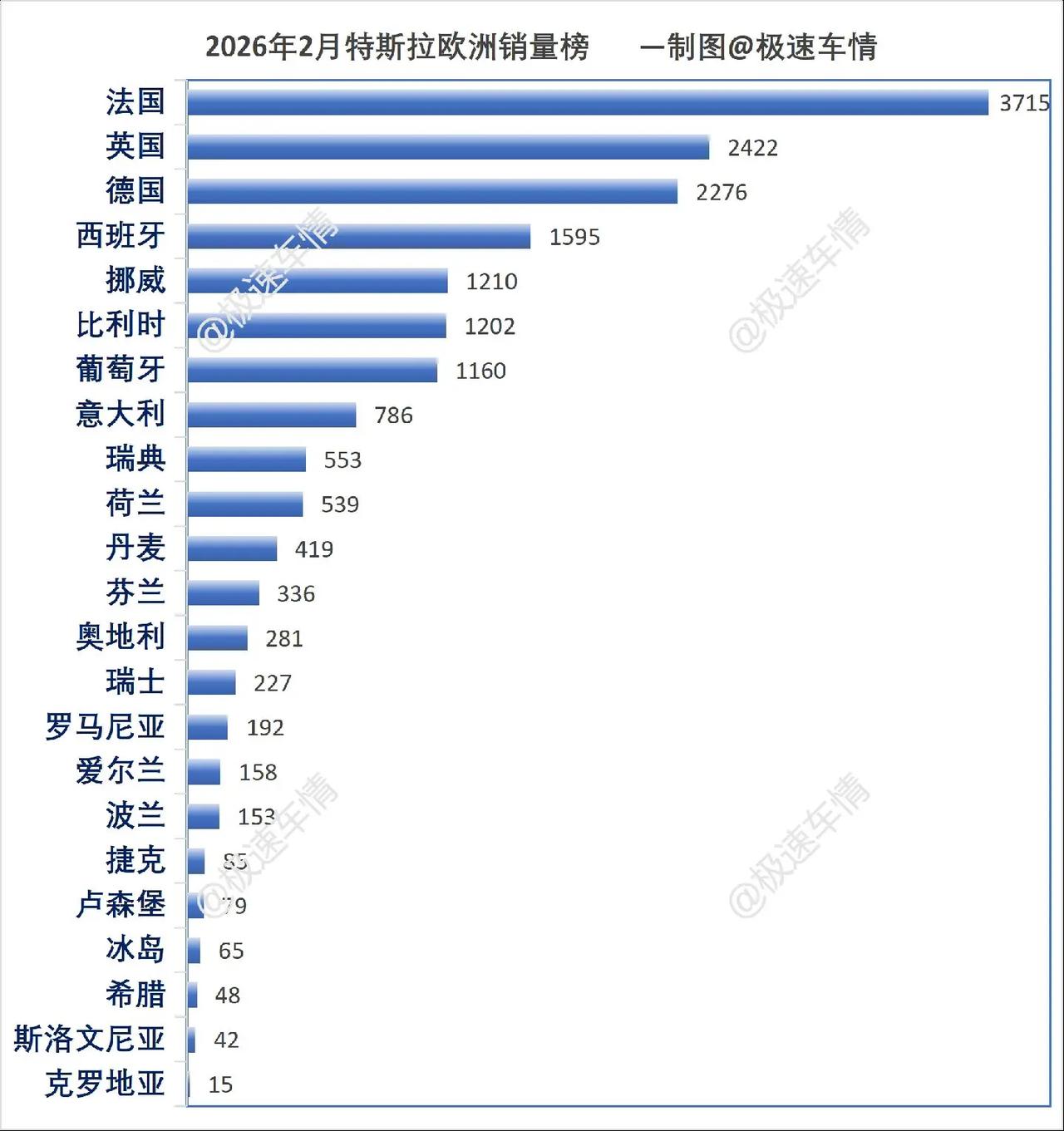 2026年2月,特斯拉欧洲销量数据!特斯拉欧洲国家销量数据出炉!极速车情 特斯拉