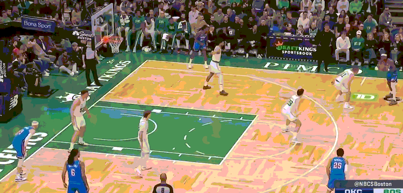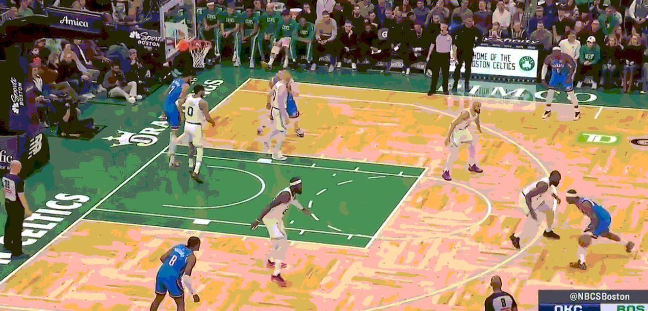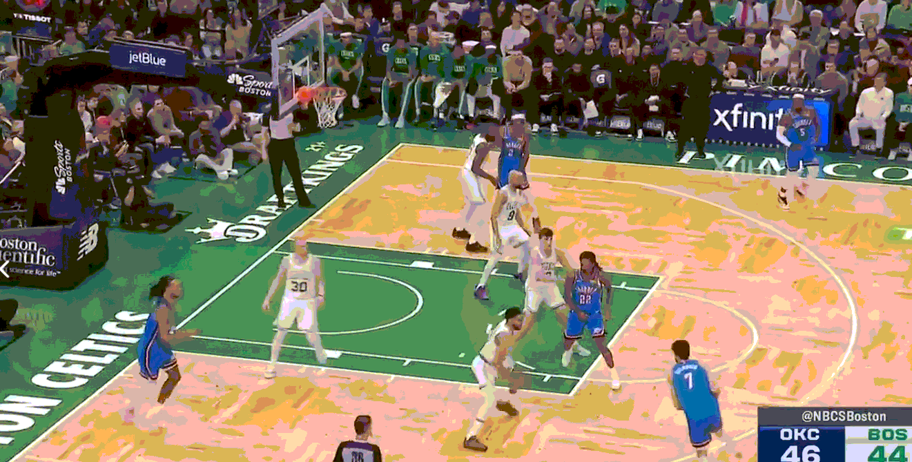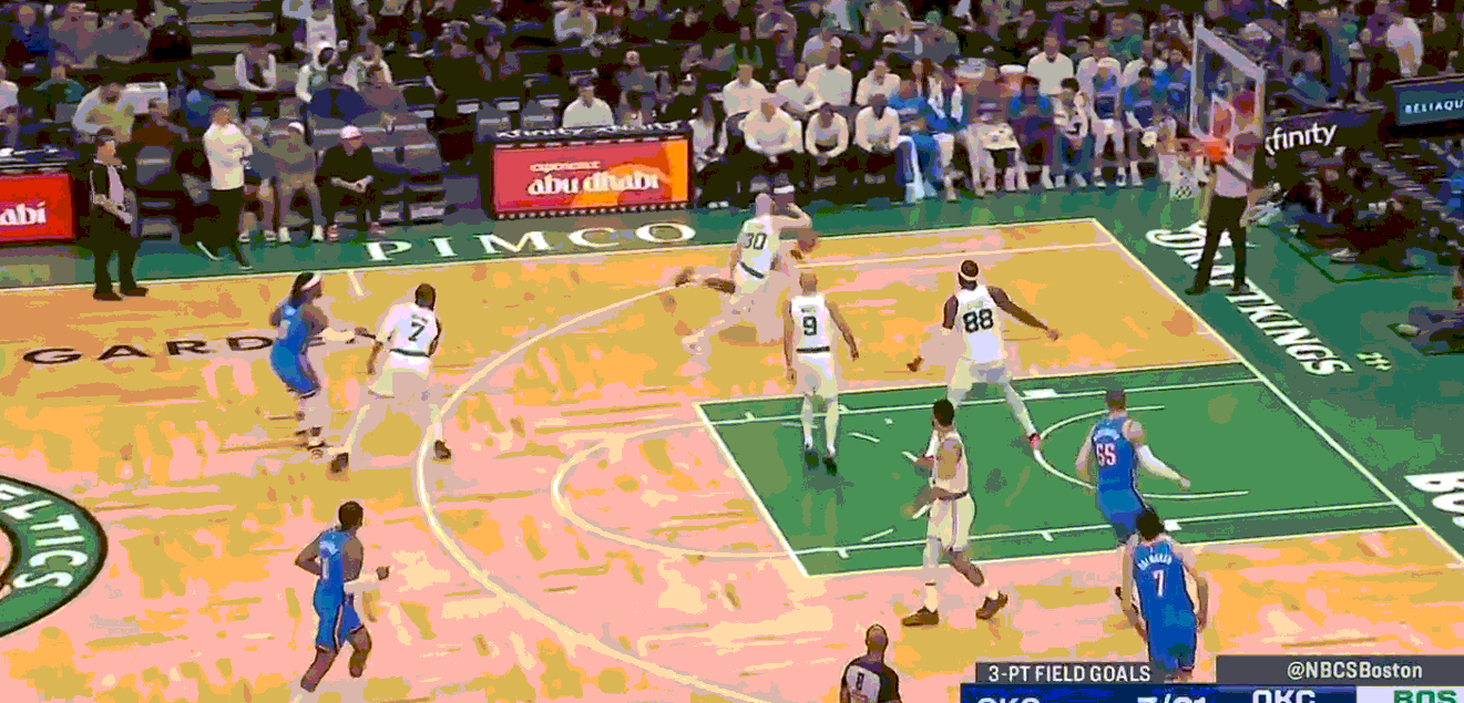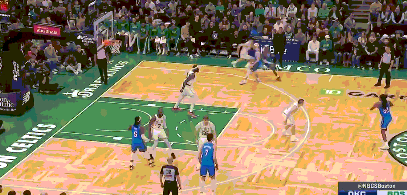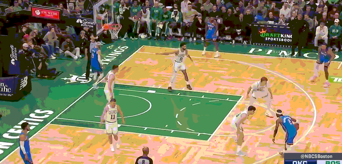 P6.牛角位怀特帮助迫使威廉姆斯停球,塔图姆紧贴侧面让他没有翻身空间,亚历山大远端非甜点位接球没有出手,他还是需要进腹地找节奏。克塔的位置非常重要,他防挡拆完全卡住了哈滕,正面又能覆盖威廉姆斯的抛投