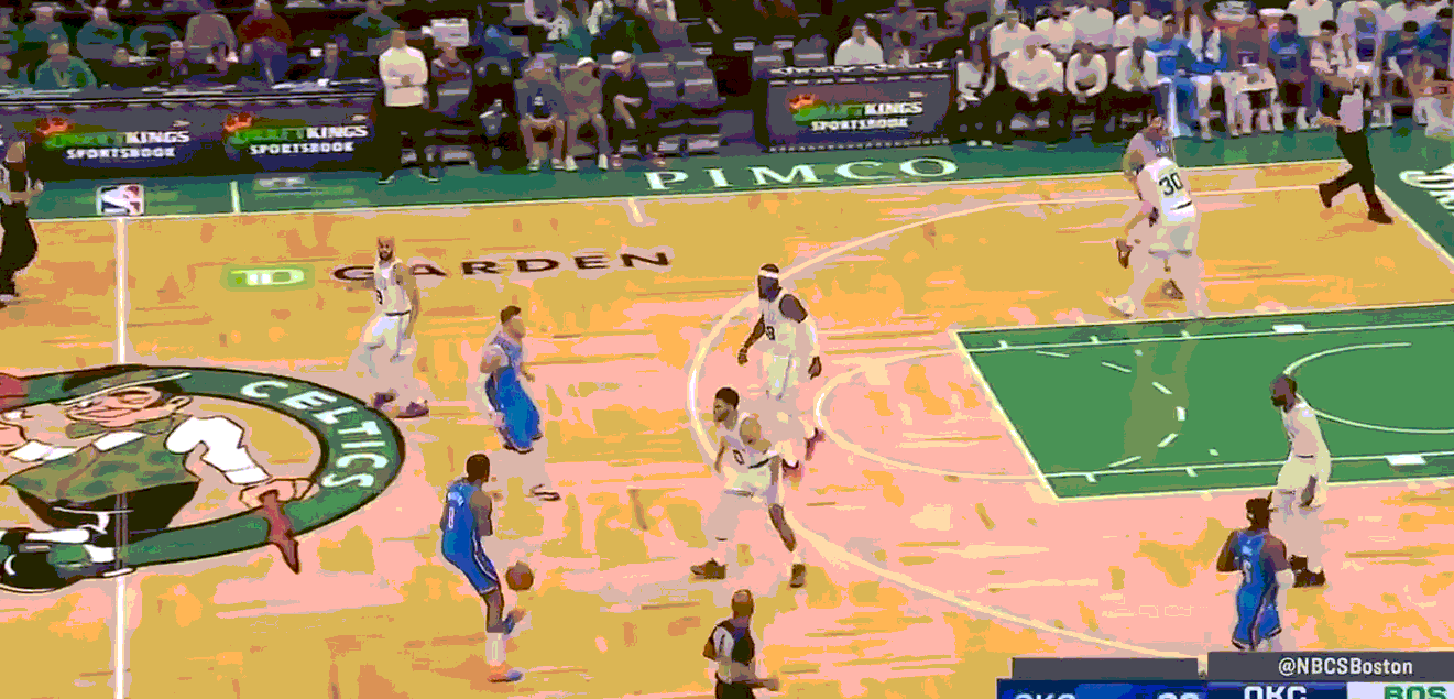 P1.对雷霆是可以用一定换防的,强侧底角的协防和底线的轮转一到位,雷霆杀筐就无望。
