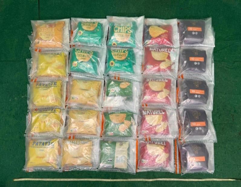 一名39岁女旅客昨日(4月1日)深夜从捷克共和国布拉格经韩国首尔飞抵香港机场。海关人员今日凌晨时分替她清关时,在其寄舱行李一批薯片包装袋内,发现重约25公斤、市值约1000万元的怀疑氯胺酮,遂把该名女子拘捕。经调查后,该名被捕人士已被控以一项贩运危险药物罪,案件将于4月4日在观塘裁判法院提堂。 海关会继续根据风险管理的原则,重点拣选来自高风险地区的旅客作清关检查;并继续根据情报分析,加强打击贩运毒品活动。 海关在涉案女子寄舱行李一批薯片包装袋内,发现重约25公斤、市值约1000万元的怀疑氯胺酮。 海关又呼吁市民提高警觉,切勿贪图金钱利益而参与贩毒活动,不要接受任何人士聘请或委托运送受管制物品进出香港,亦切勿于未确定物品属性的情况下,贸然协助他人运送。根据《危险药物条例》,贩运危险药物属严重罪行,一经定罪,最高可被判罚款500万元及终身监禁。