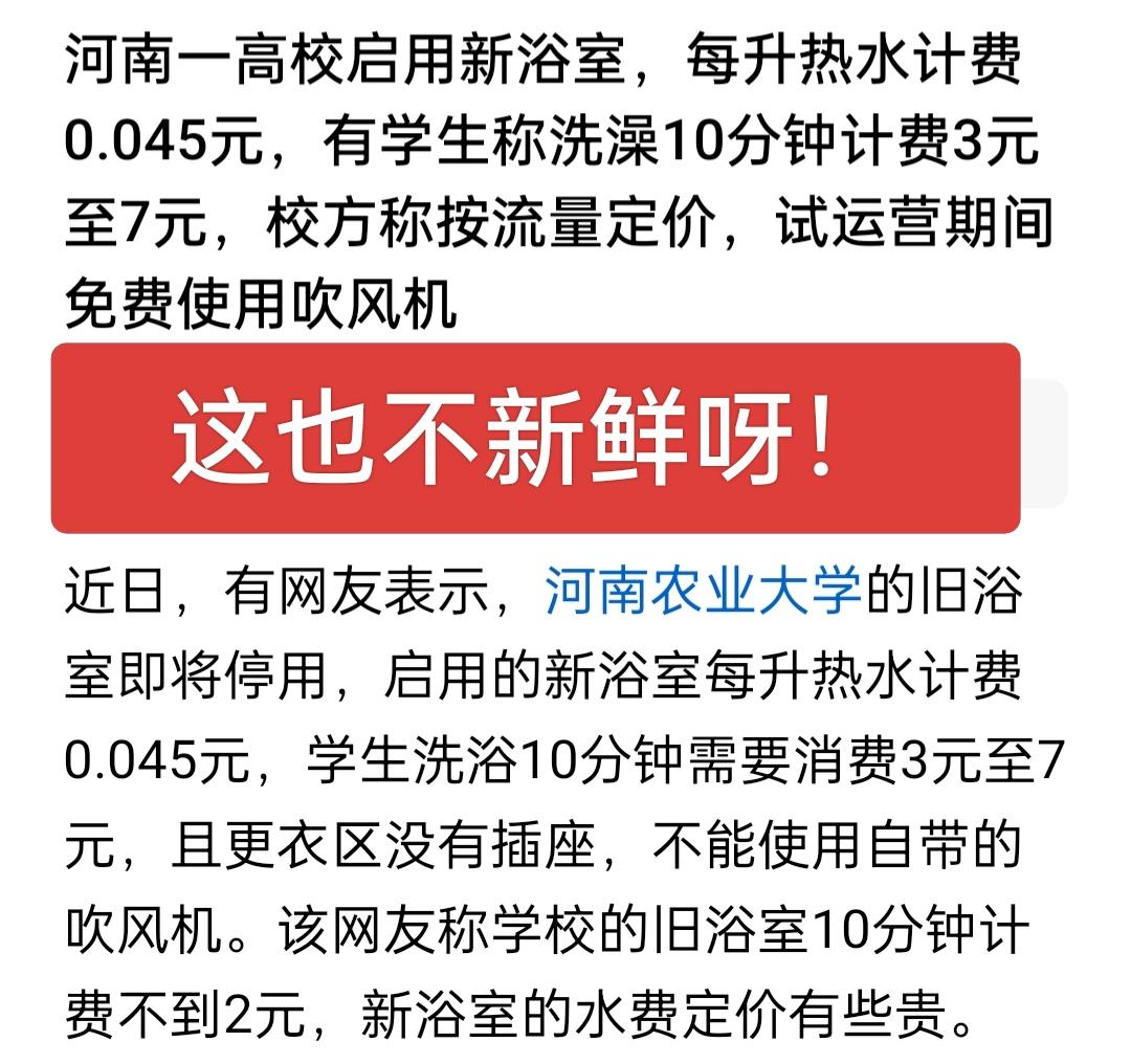 别说大学了,现在初中高中浴室都开始高收费了,学校是教学的场所,不应以营利为目的,洗个澡花个十来块,吹个头也要几块,象话吗? 慢慢会演变成教室,桌椅,照明等等都要收费,让本该无偿提供的服务,都变成牟利的工具,完全违背了的初衷。