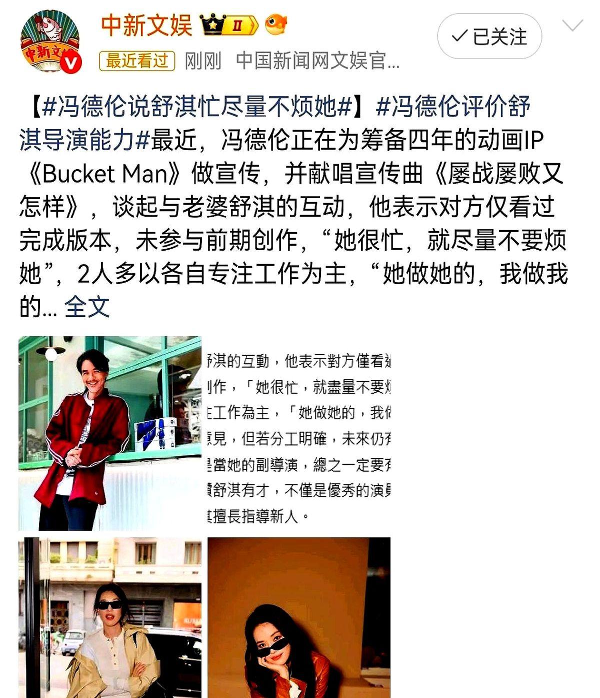 冯德伦说俩人千万别合作!这话说得真够直接。 最近他宣传新歌,记者肯定要问舒淇。他直接笑说,舒淇太忙了,他的动画只给她看成品,前期不打扰。 还补了一句金句:“如果两人都有创作意见时,千万不要合作,这是相处之道”。要么你导我演,要么我导你演,必须一个人说了算。 舒淇那边拿了新晋导演奖,也挺默契。被问到合作唱歌,直接拒绝,说不是自己专长。年底会一次性感谢所有人,包括老公。 这种成年人的边界感,真的挺舒服的。大家觉得呢?