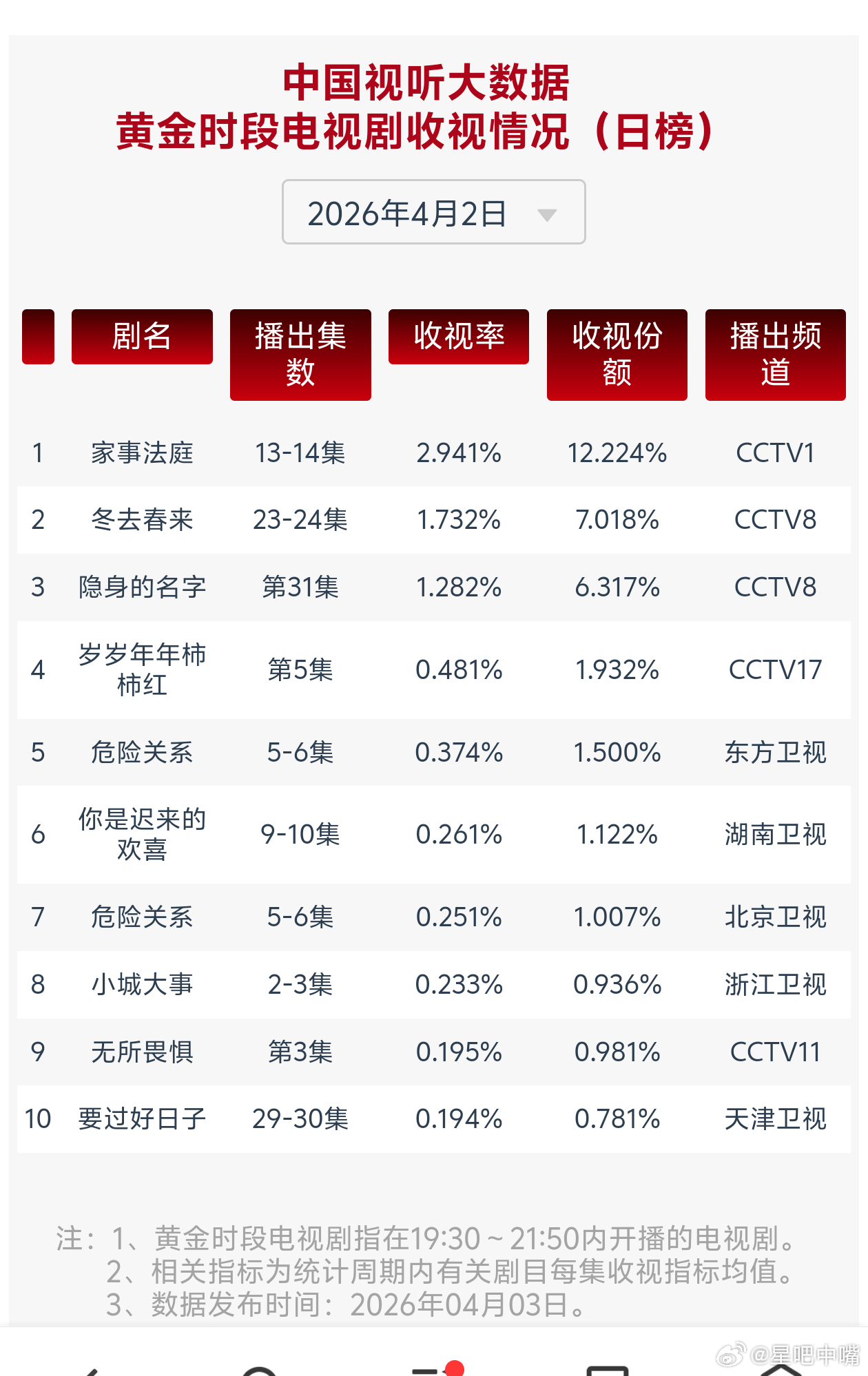 4月2日cvb收视日报!家事法庭2.941,酷云1.5910,系数1.848