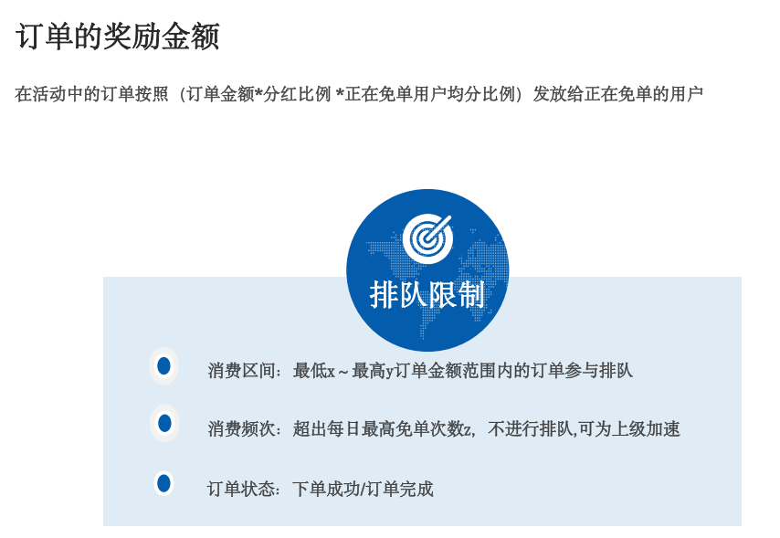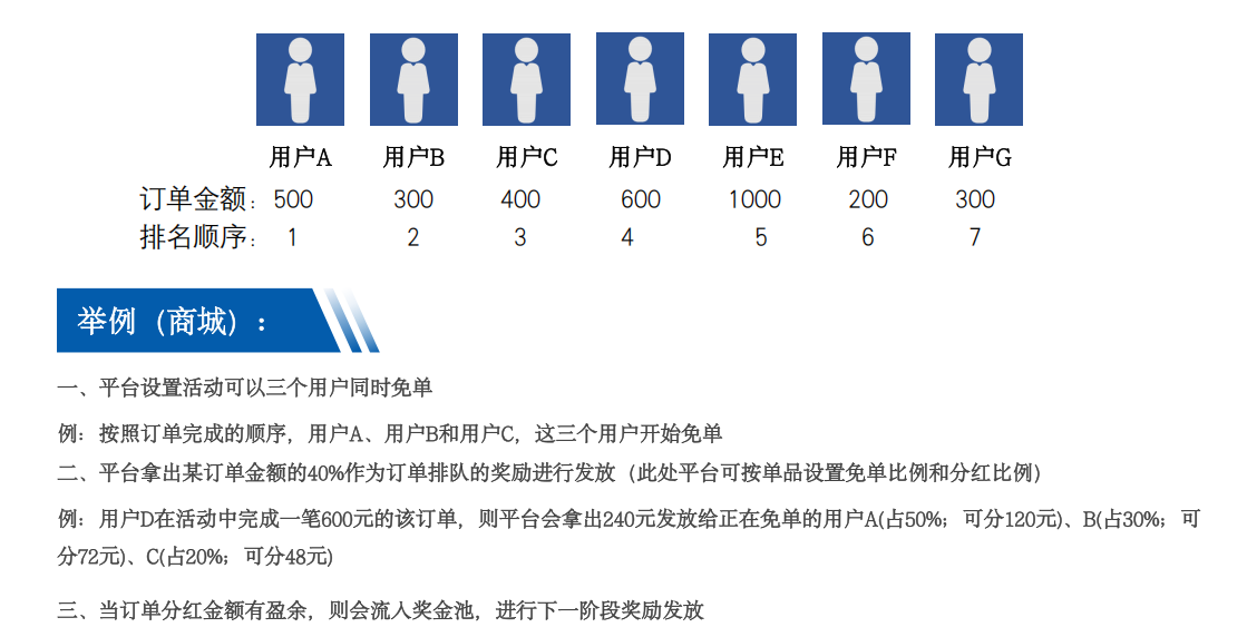 所得奖励直接累积进其免单进度,进度满额即免单成功,由后续排队者递补。