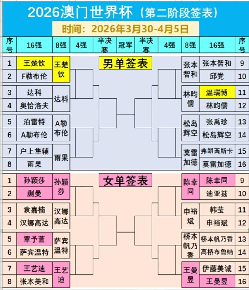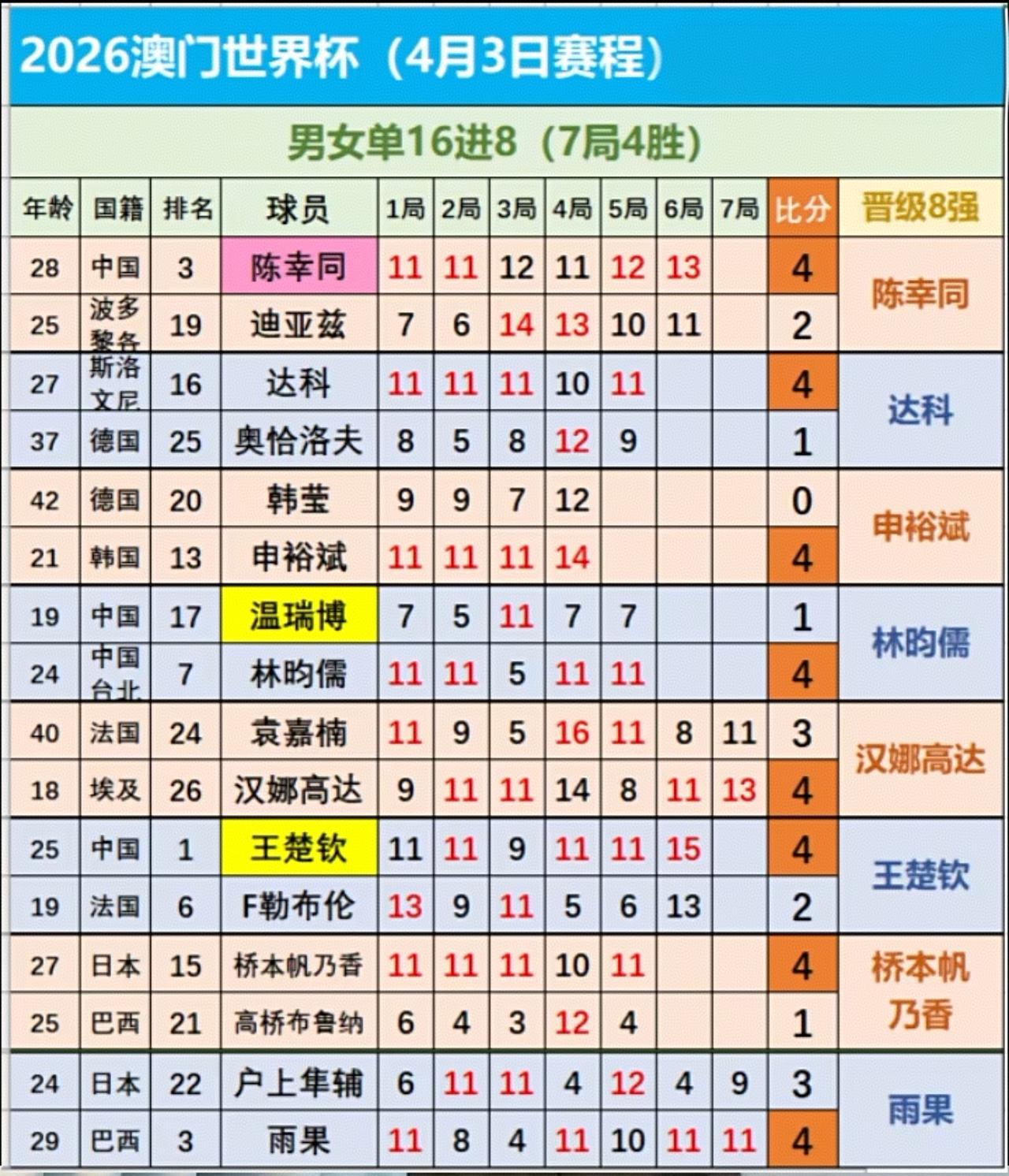 澳门世界杯4月4日赛程:关注王楚钦仍然在战斗;聚焦国女乒能否包揽四强