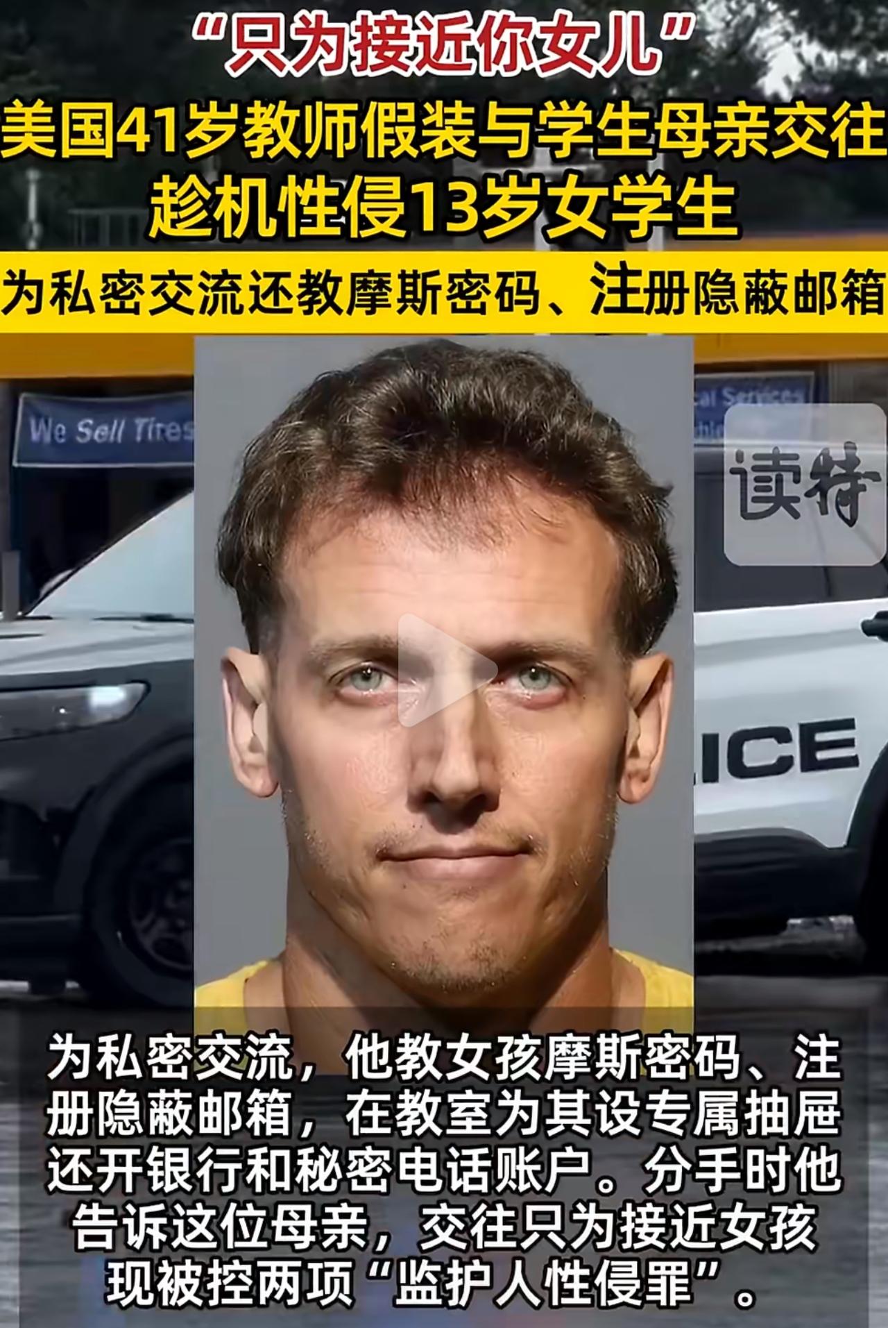 美国佛罗里达州41岁男教师丹尼尔,从2023年10月就开始打歪主意,故意跟班上女生的妈妈谈恋爱,一谈就是三个月。表面上对母女俩嘘寒问暖,还总叫她们去自己家住,看着这位妈妈完全放下戒心,他心里的龌龊想法藏都藏不住,就等着找机会侵害女孩。 他专门趁女孩起夜,偷偷跟着进卫生间施暴,事后怕事情败露,更是想尽办法控制女孩。教她摩斯密码偷偷联系,用一次性邮箱发消息,教室留专属抽屉,甚至偷偷办秘密电话卡、开银行账户,步步都是精心设计的圈套,把小女孩拿捏得死死的。 直到俩人分手,他才直接摊牌:跟你谈恋爱,就是为了接近你女儿!这话直接把女孩妈妈击垮了,又悔又恨,根本没法接受自己引狼入室。今年3月丹尼尔被抓,被控两项监护人性侵罪,直接被关了不准保释。 更让人难受的是,这种老师侵害学生的事还不少,特教孩子、男学生都容易遭殃,尤其是男童受害,还总被人误解,敢站出来报案的少之又少。 真的想说,披着好人外皮的恶魔最可怕,利用信任伤害孩子太缺德。也提醒所有家长,千万别盲目相信身边人,孩子的安全,真的半点都不能大意!代表建议从重处罚教师性侵未成年人 监护人性侵未成年人撤销监护人资格 美国教师