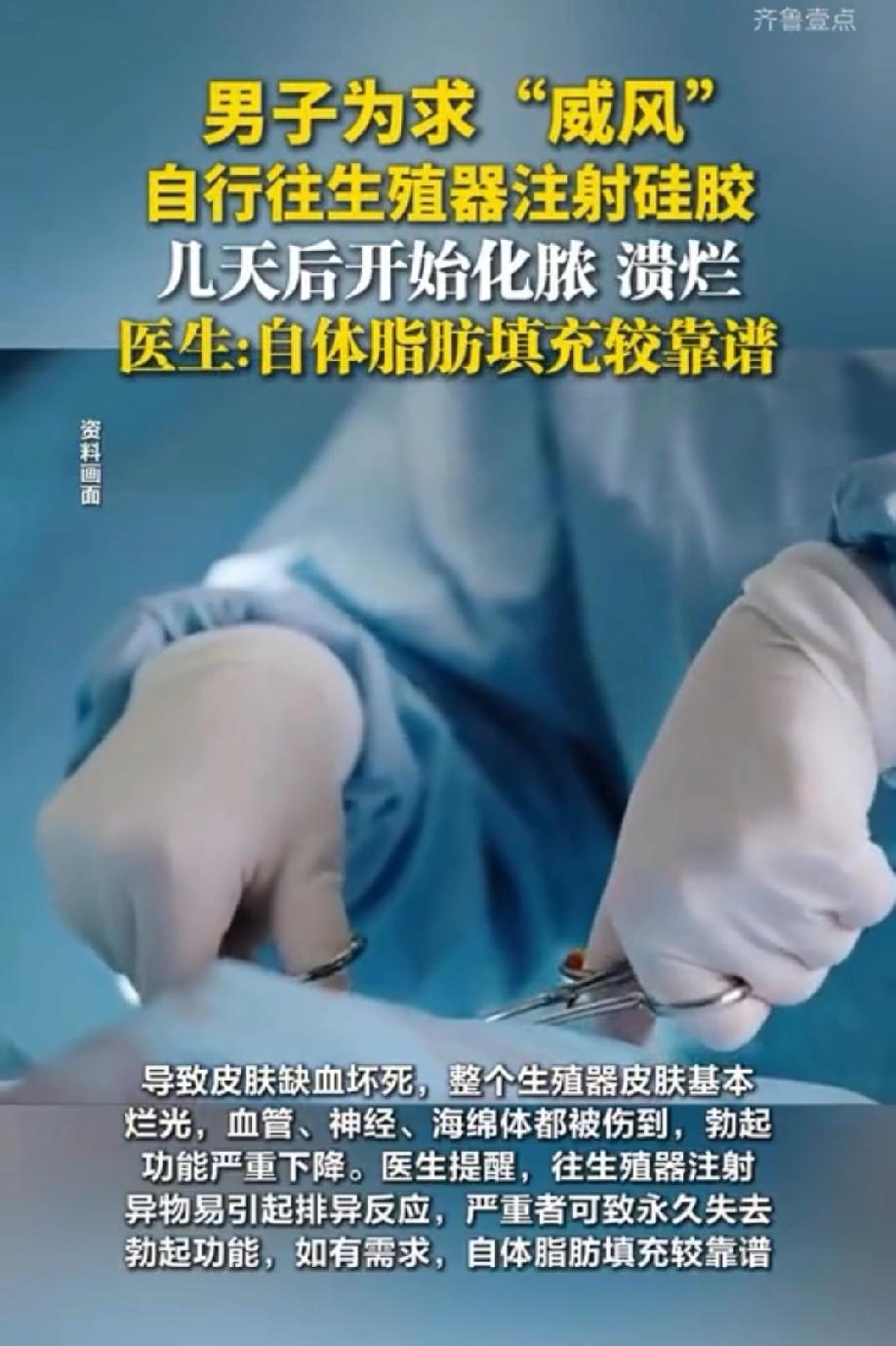 当晚,李某就在自家的卫生间里,对着镜子给自己扎针,他咬着牙,硬生生往生殖器里推进了足足177克硅胶。