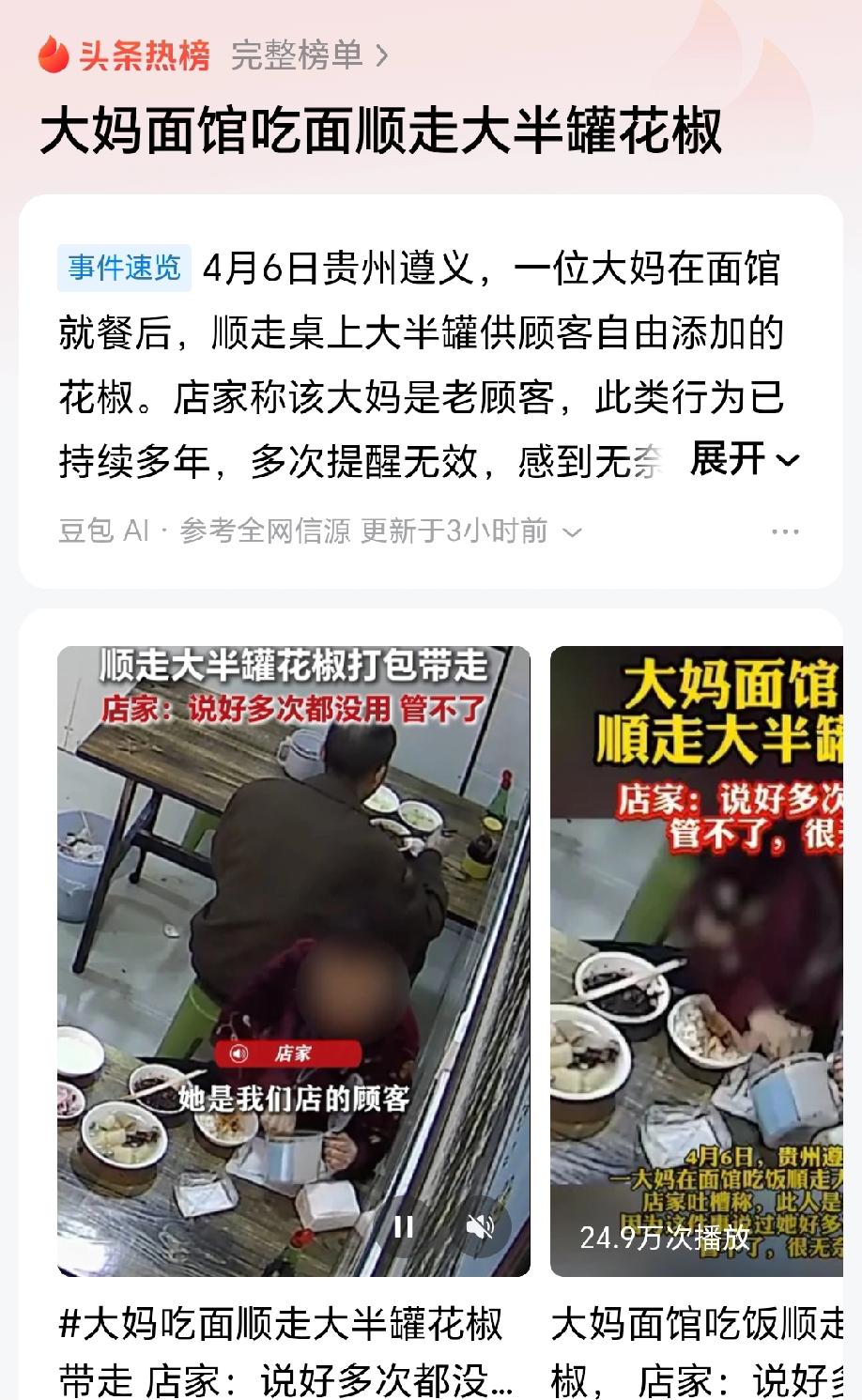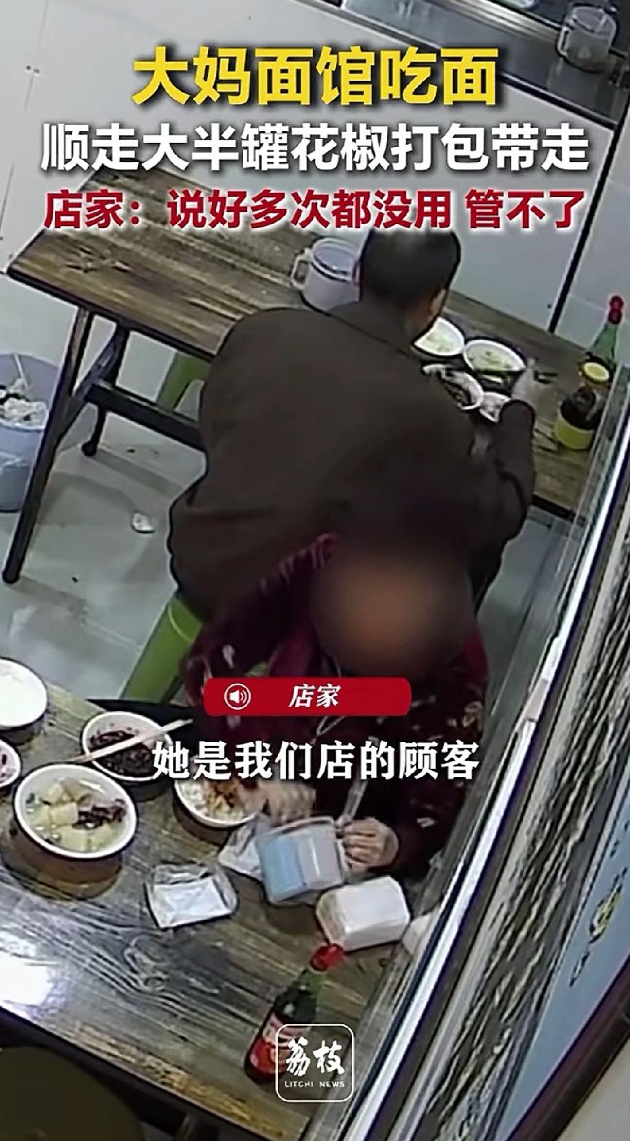 贵州遵义,大妈在面馆吃完面,趁着没人注意,每次都要顺走店里的半罐花椒,用桌上的餐巾纸包起来,装进兜里偷偷拿走。老板非常无奈,大妈说老顾客了,每次都这样,没得办法。要是觉得我家的花椒好吃,直接告诉我,我送她两斤都可以,为什么要这么偷偷摸摸呢?