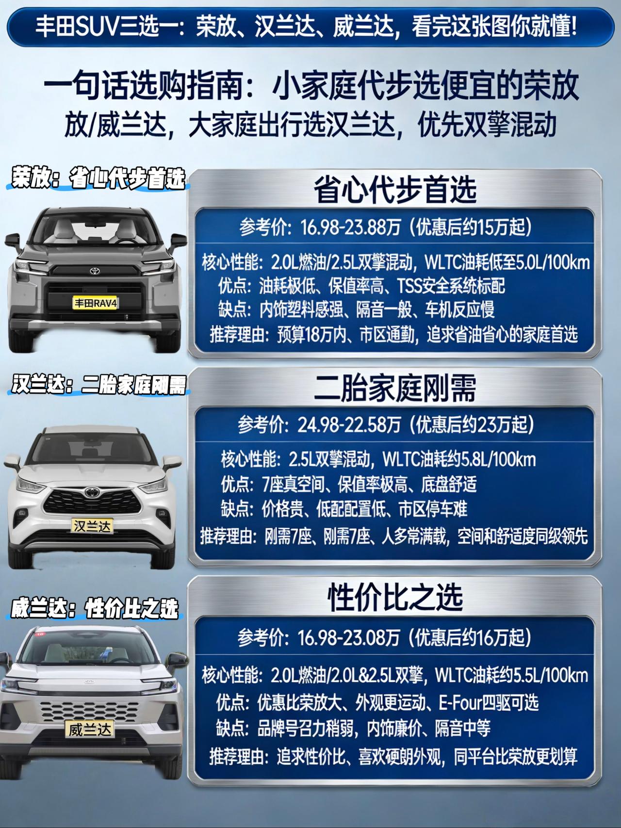 丰田SUV三选一:荣放、汉兰达、威兰达,看完这张图你就懂!