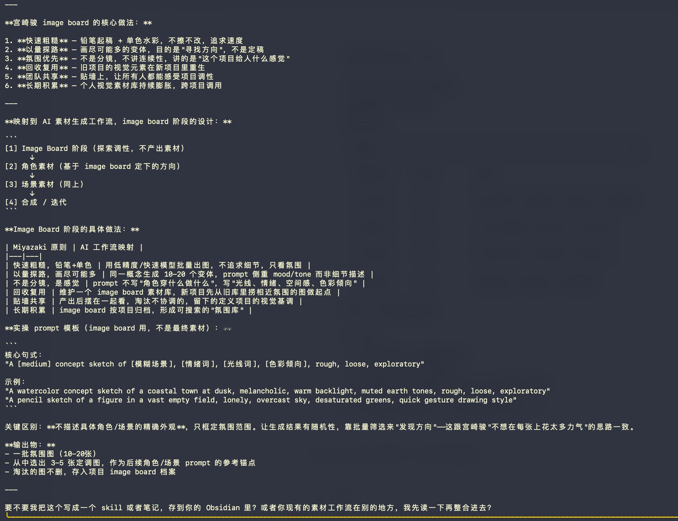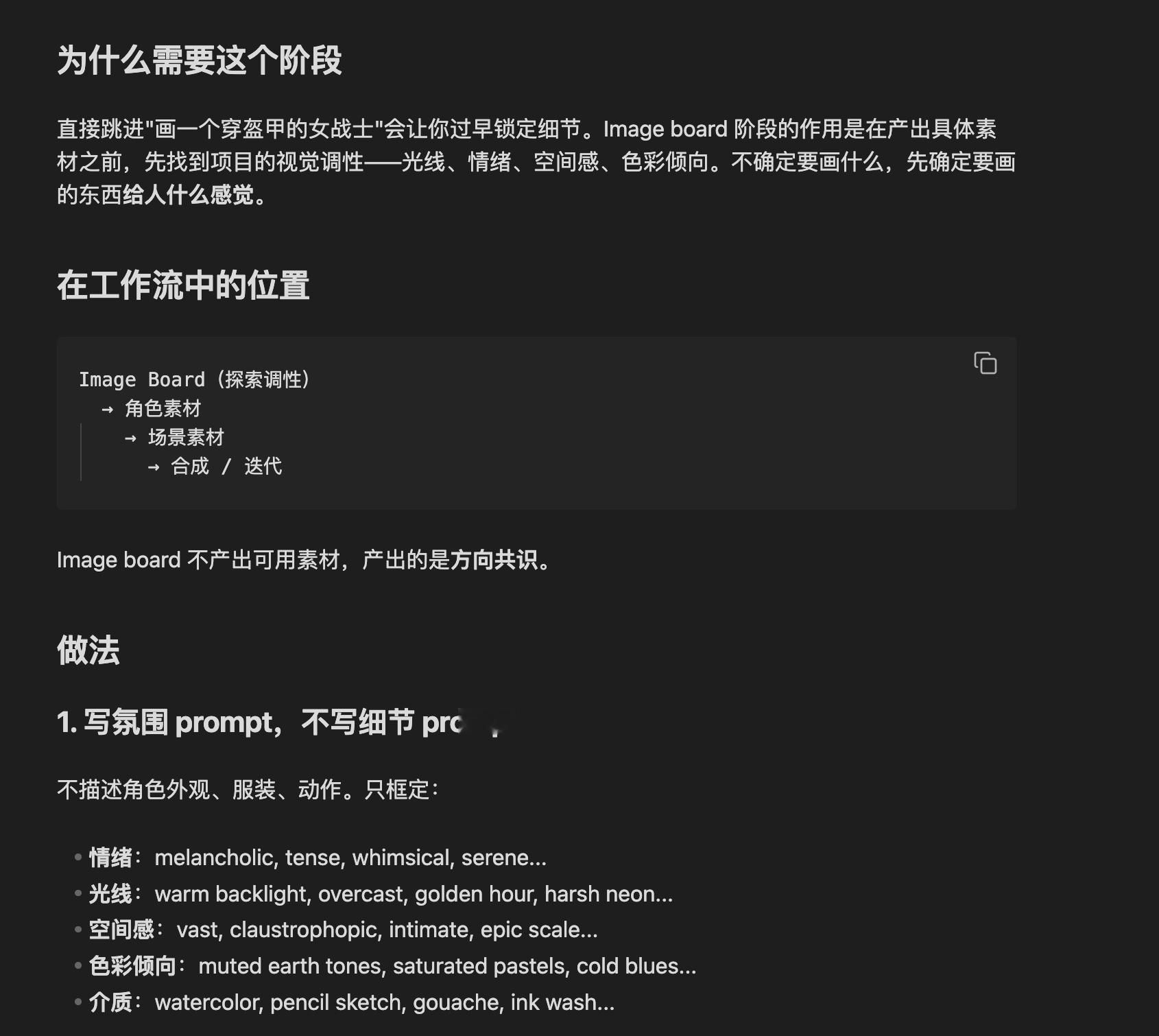 感觉这个做法在 AI 时代更方便了,试着让 agent 把这篇文章拆成一个 skill,在人物、场景设定图之前加上这个环节,批量做风格探索(光线、情绪、空间感、色彩倾向)