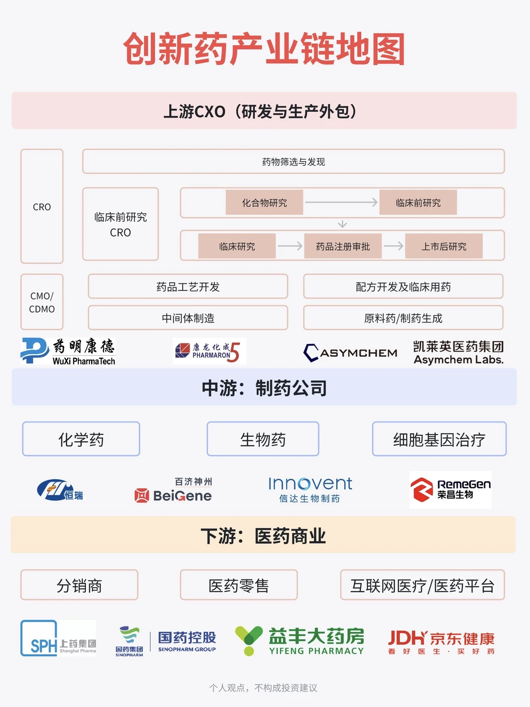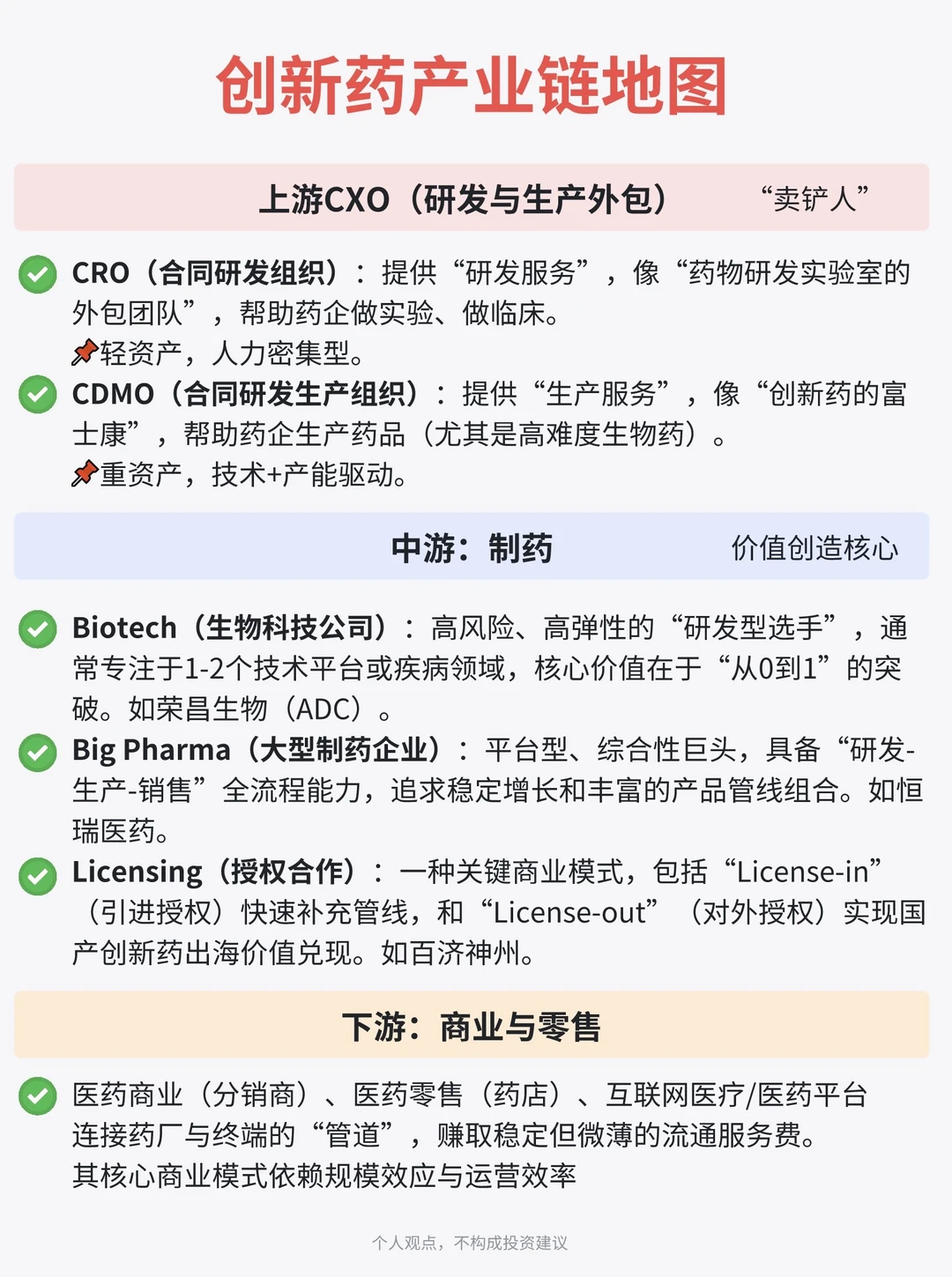 从产业链价值看。聚焦于国内医保市场、产品同质化严重的环节(中下游)将持续承压❌。真正的机遇集中于拥有全球视野和创新壁垒的环节✔。