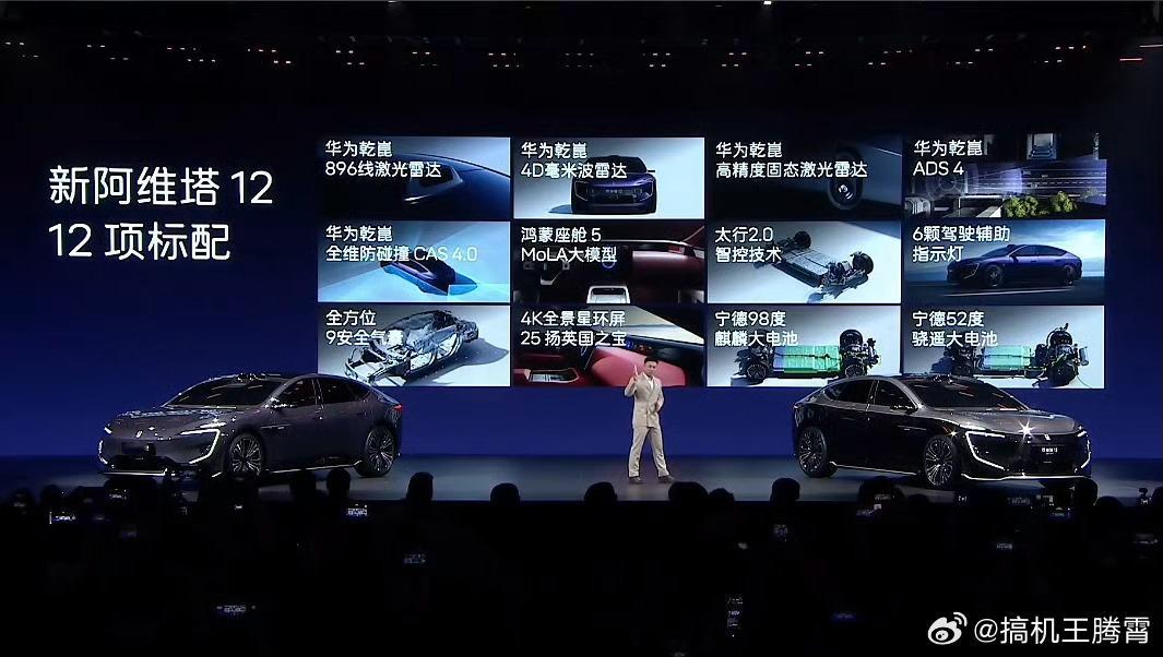 新阿维塔12上市新阿维塔12正式上市了,保留了F型高辨识度头灯,无后舷窗设计,前排双纳帕零重力座椅,全新35.4英寸全景新环屏,配了全新的电子外后视镜,顶部896线激光雷达,和宁德合作开发了H型电池,增加了后排空间。总共6种车身颜色,B柱上放了一枚和华为乾崑共创的标识,门把手改成了半隐藏式,方向盘新增一键语音和一键加速按钮,用上了新一代电磁避震,零百最快2.71秒,增程版搭载52.01度电池,纯电续航350km,纯电版搭载98.07度宁德6C麒麟电池。