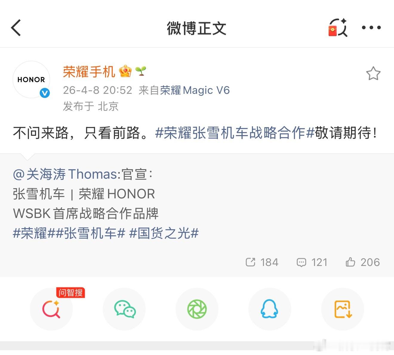 荣耀张雪机车战略合作耀子可以的,这波速度很快,之后张雪的赛车上能看到荣耀Logo了,当然我还是更期待张雪能和荣耀在产品上有更深层次的合作,例如搞个联名款手机啥的,共同推动中国智造走向世界,可以吧