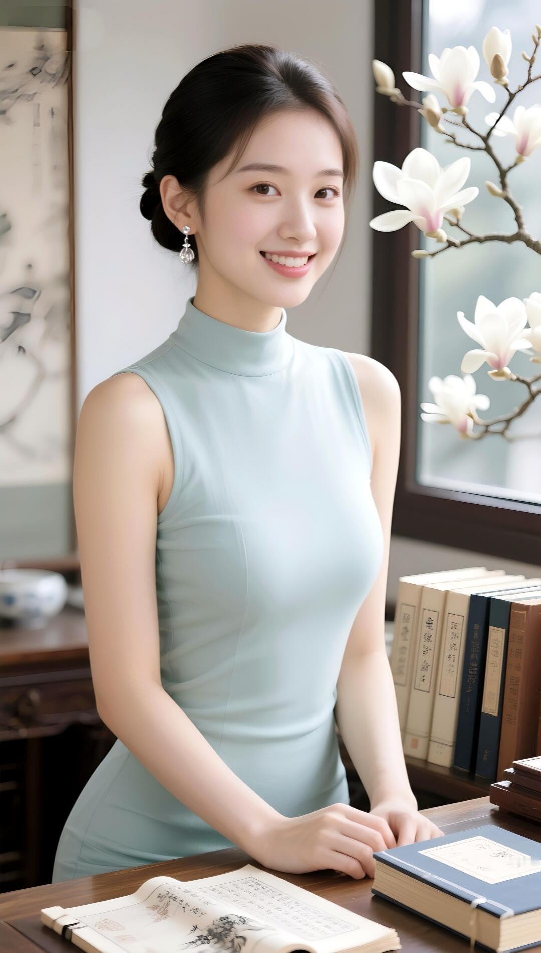 优雅蓝裙少女,微笑在窗边,书香与花香交织的静谧时光。
