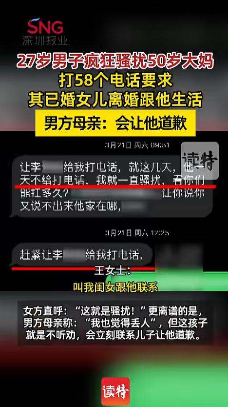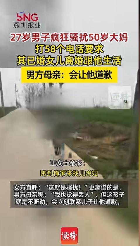 信息来源:《【27岁男子骚扰50岁大妈要求其已婚女儿离婚跟他过】 男方母亲:会让他道歉》深圳新闻网