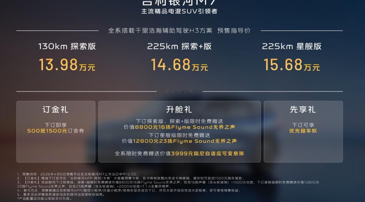吉利银河M7全球预售开启!搭载神盾金砖电池,225km纯电续航、1730km综合续航,馈电油耗仅3.35L,通勤零焦虑、长途无压力。81km/h麋鹿测试、35.6米同级最短制动,操控稳如轿车。全系标配千里浩瀚H3智驾,高速NOA+全场景智能泊车,新手老手皆安心。Flyme Auto 2座舱配龍鹰一号芯片,智能交互流畅。预售价13.98万起,下订享500抵1500及免费音响权益,王炸实力重塑主流电混SUV格局!