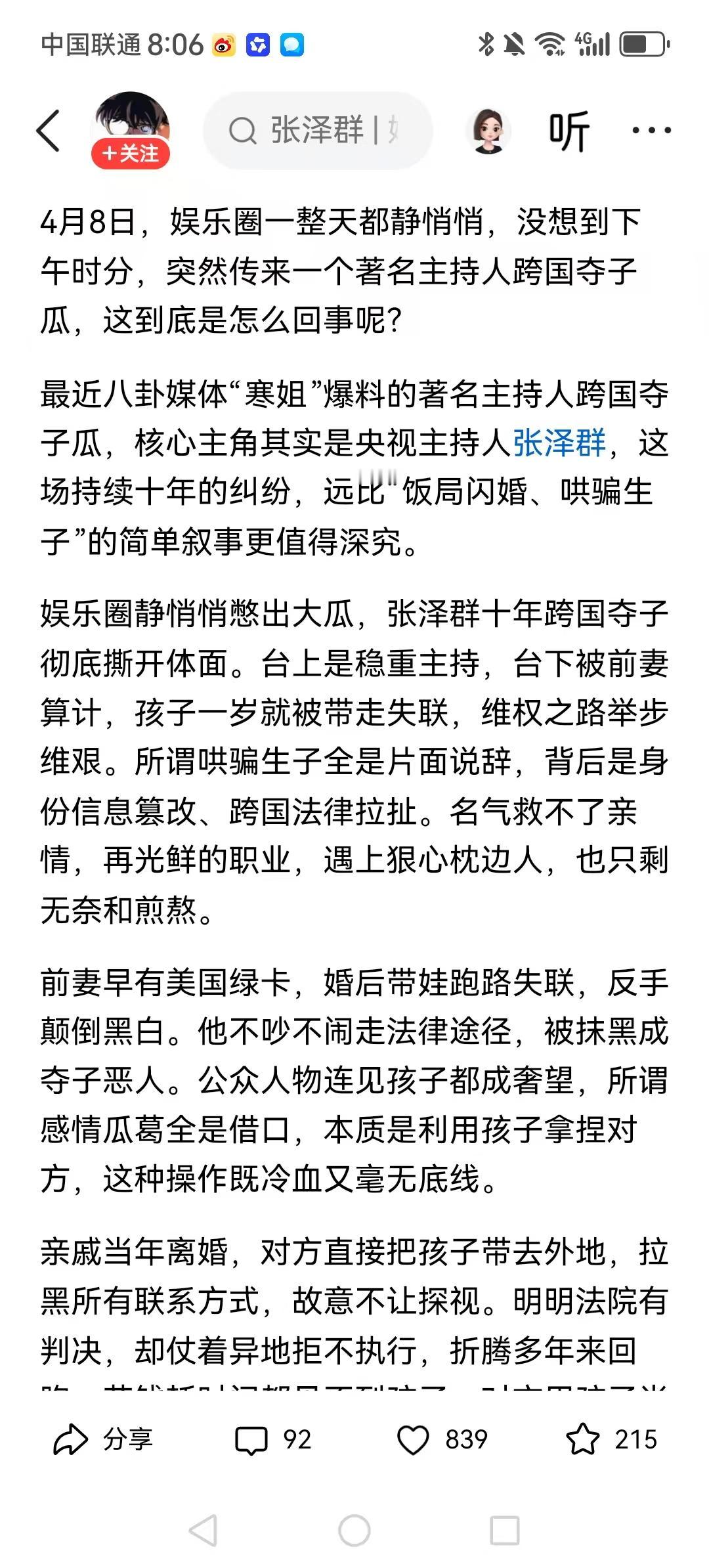 著名主持人跨国夺子瓜,核心主角其实是央视主持人张泽群。女方能做的这么绝,和孩子做