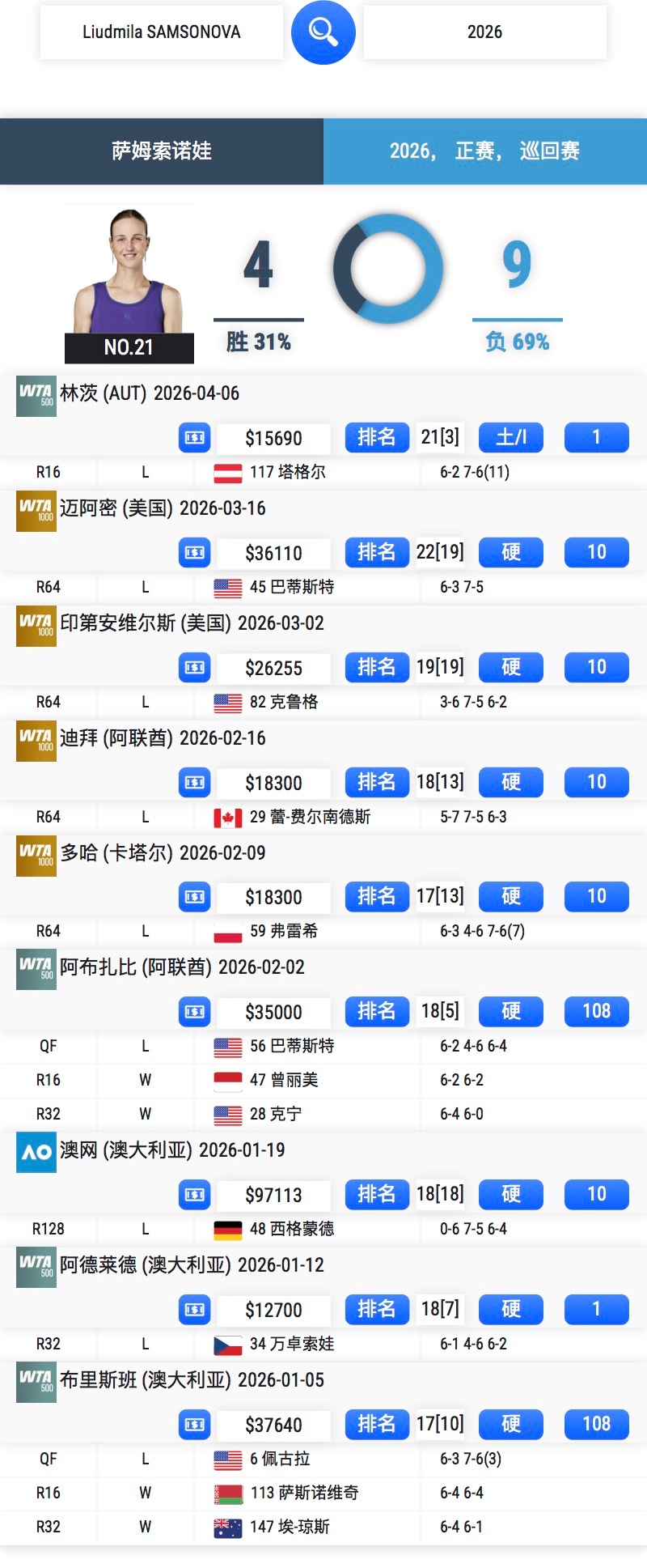 奶茶娃和压力娃今年的战绩……🇷🇺萨姆索诺娃:4胜9负,遭遇7次一轮游,目前6