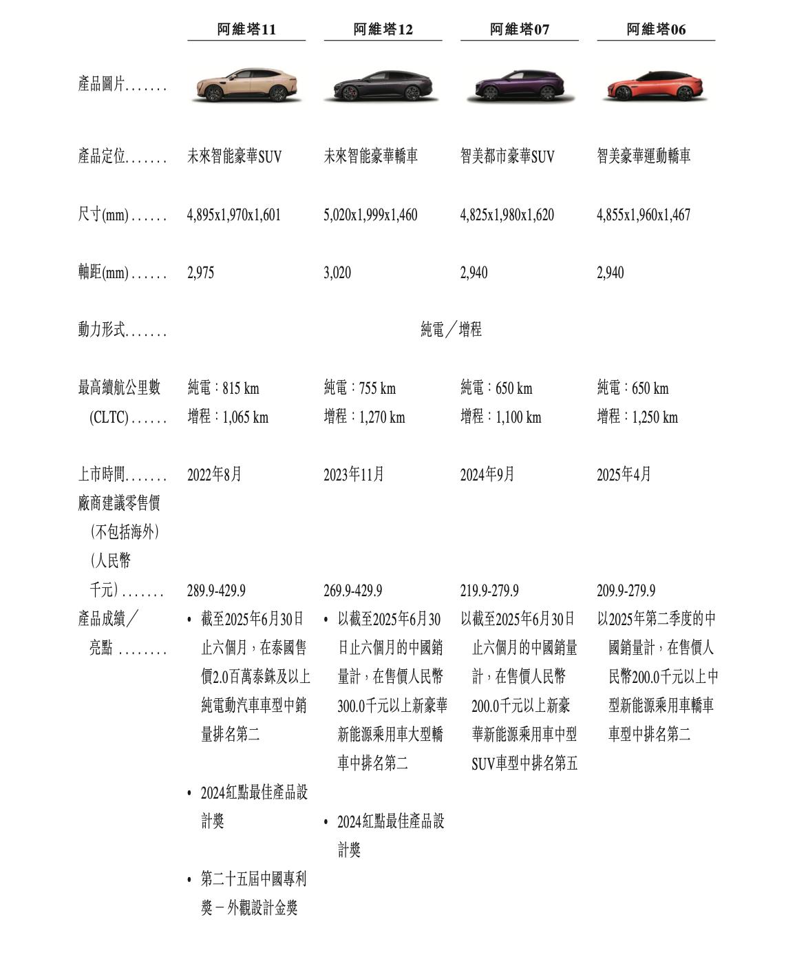 截至最后实际可行日期,阿维塔已推出四款主要量产车型,车辆售价介于20万-70万元,即阿维塔06(智美豪华运动轿车)、07(智美都市豪华SUV)、11(量产旗舰车型未来智能豪华SUV)、12(未来智能豪华轿车)。就阿维塔11及12而言,公司亦推出了皇家剧院系列及限量版“0”系列,即阿维塔011及阿维塔012。