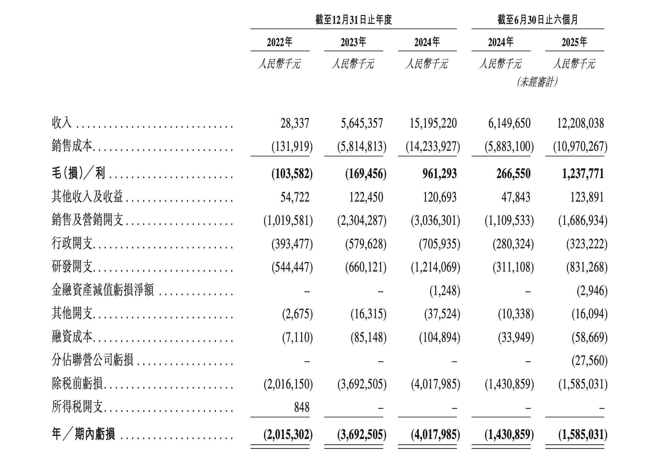 2022-2024年及今年上半年(下称:报告期),阿维塔的收入分别约2833.7万、56.45亿、151.95亿、122.08亿元;毛利分别约-1.04亿、-1.69亿、9.61亿、12.38亿元,毛利率分别为-365.5%、-3.0%、6.3%、10.1%;净亏损分别约20.15亿、36.93亿、40.18亿、15.85亿元。