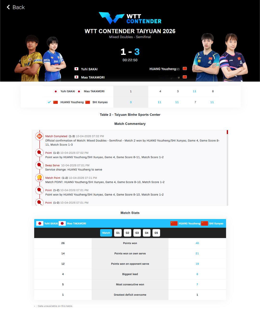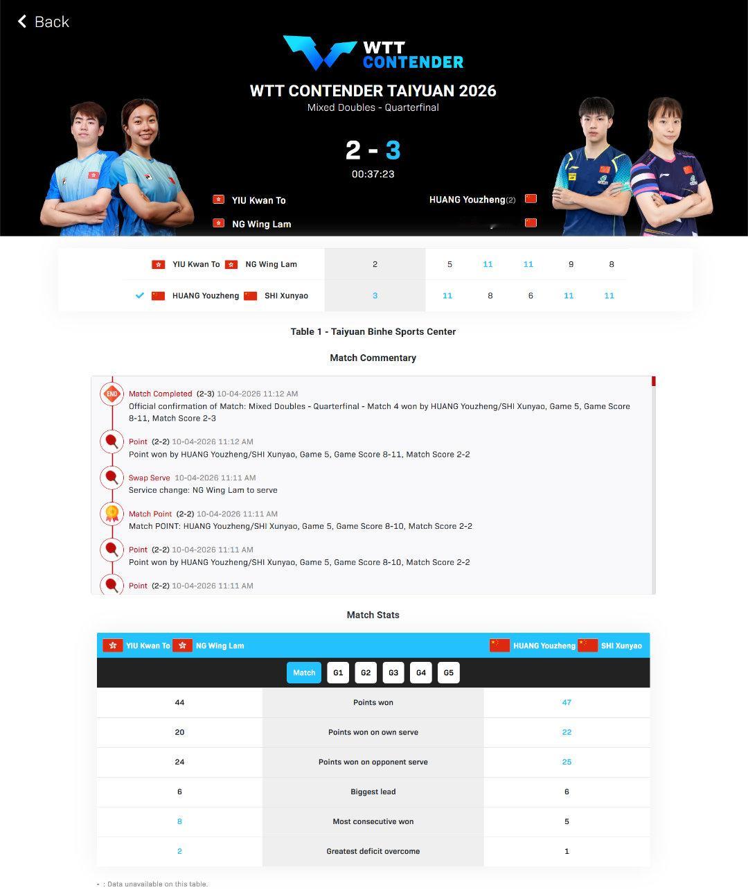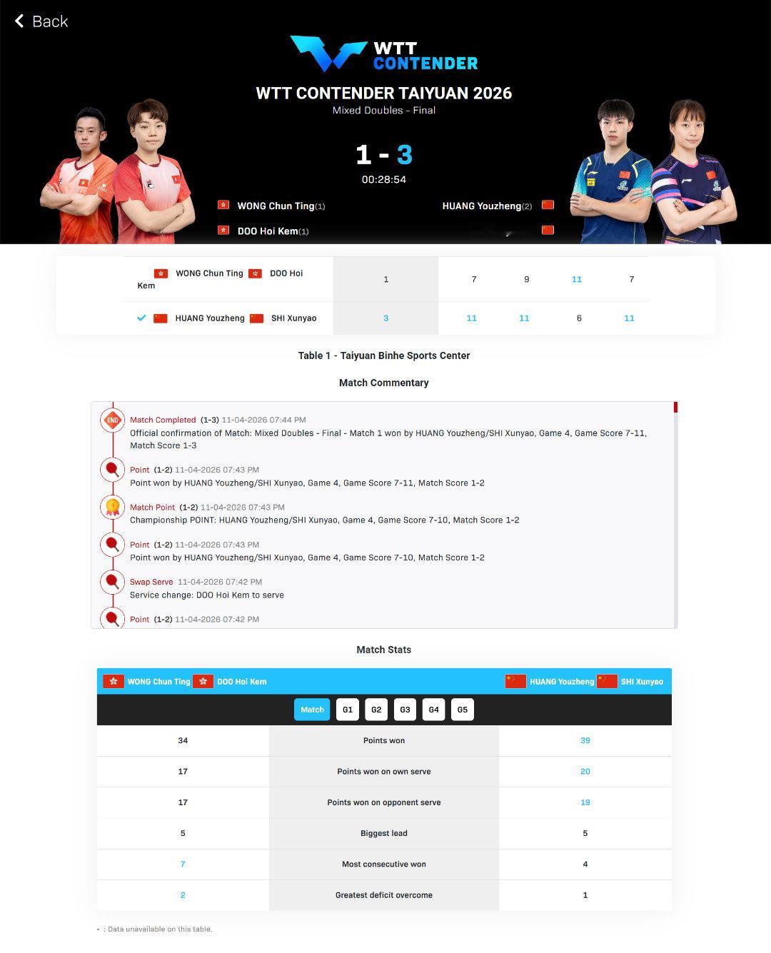 🏓04.10『正赛第二比赛日』📎混合双打1/4决赛黄友政/石洵瑶🇨🇳3-2姚钧涛/吴咏琳🇭🇰📎男子单打1/8决赛黄友政🇨🇳2-3托米斯拉夫·普卡🇭🇷📎男子双打1/4决赛黄友政/林诗栋🇨🇳3-1英田理志/坂井雄飞🇯🇵📎混合双打半决赛黄友政/石洵瑶🇨🇳3-1坂井雄飞/高森爱央🇯🇵